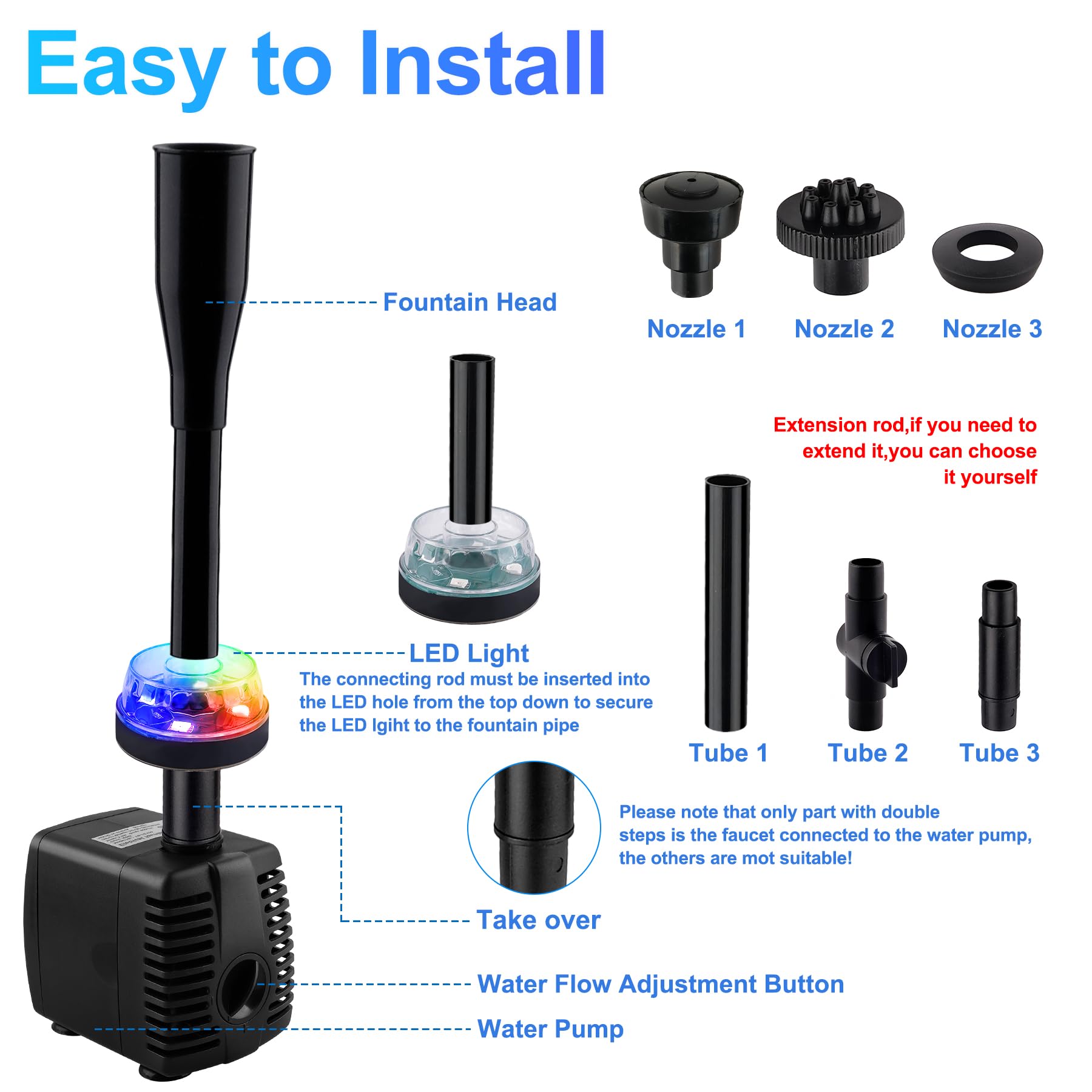 - 🌈4 Water Patterns---NATPOW submersible water pump with Mushroom, Fireworks, Double shower, Single shower. Select the pattern you want in this accessory pack. Each patterns can be used individually