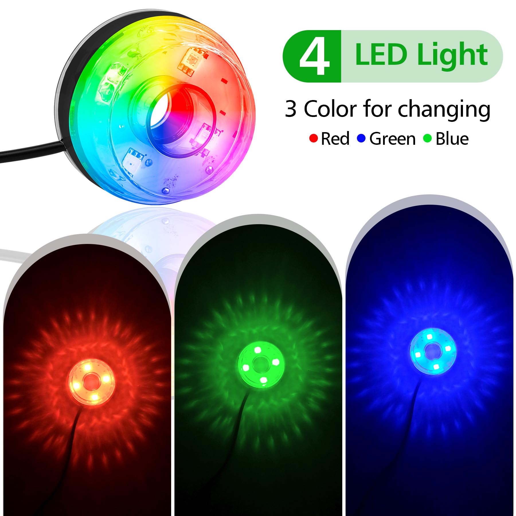 - 🌈3 Colorful Led Lights - This Fountain water Pump uses 42 super bright energy-saving LED lights with 3colors (red, blue, green). The Led lights provide amazing night lighting effect for decorating Outdoor fountain, Pet fountains, Garden, Fish tanks, Small water features, Ponds, Small pool, aquariums, Hydroponic, Statuary. The water pump and LED light are completely waterproof and can work continuously for 24 hours,automatically color changing, it is uncontrollable.