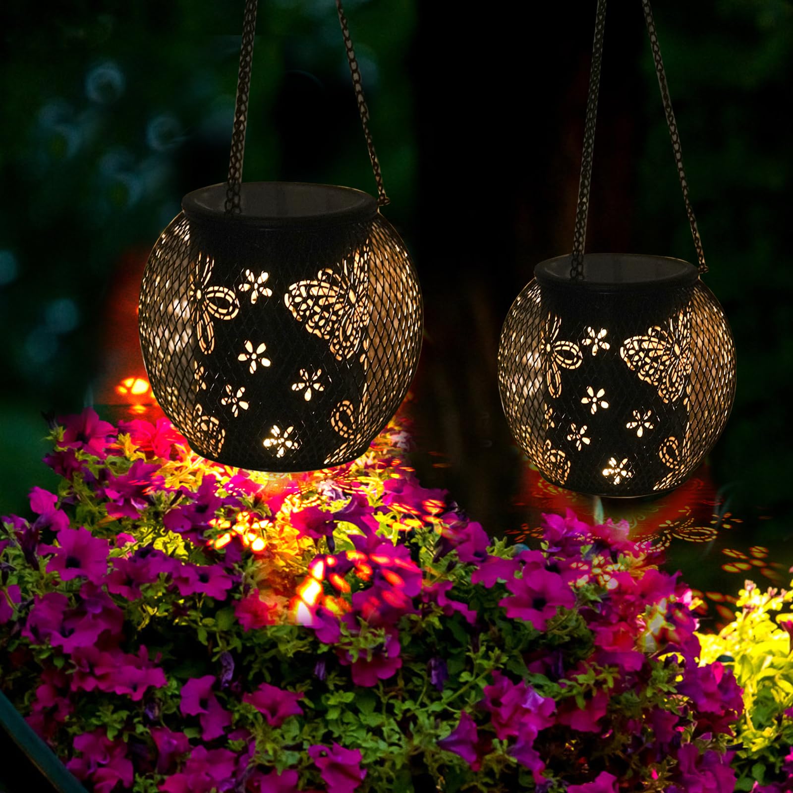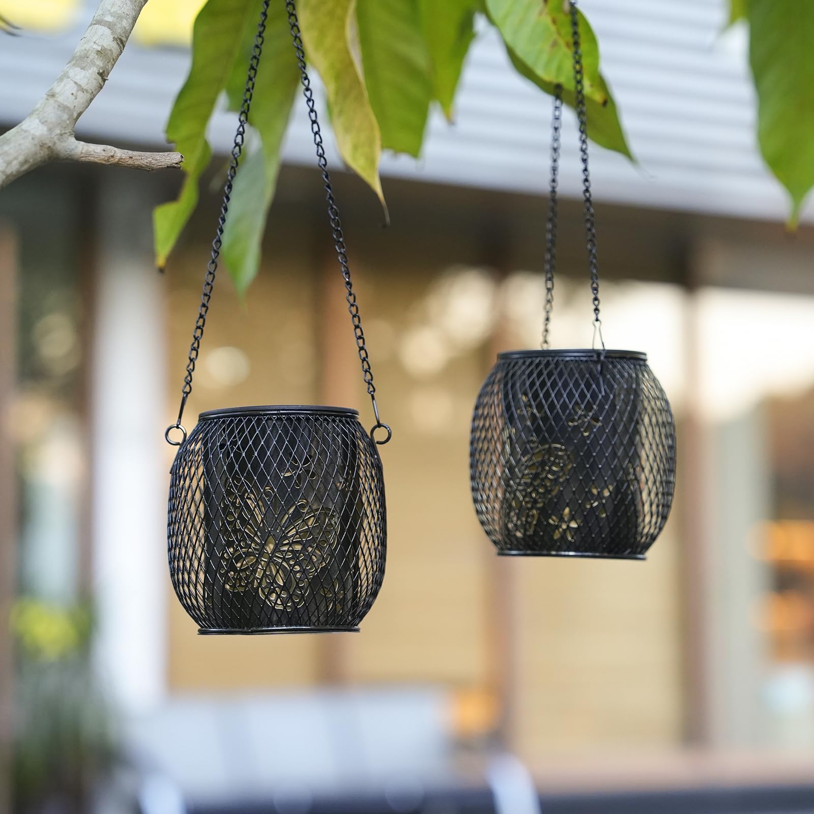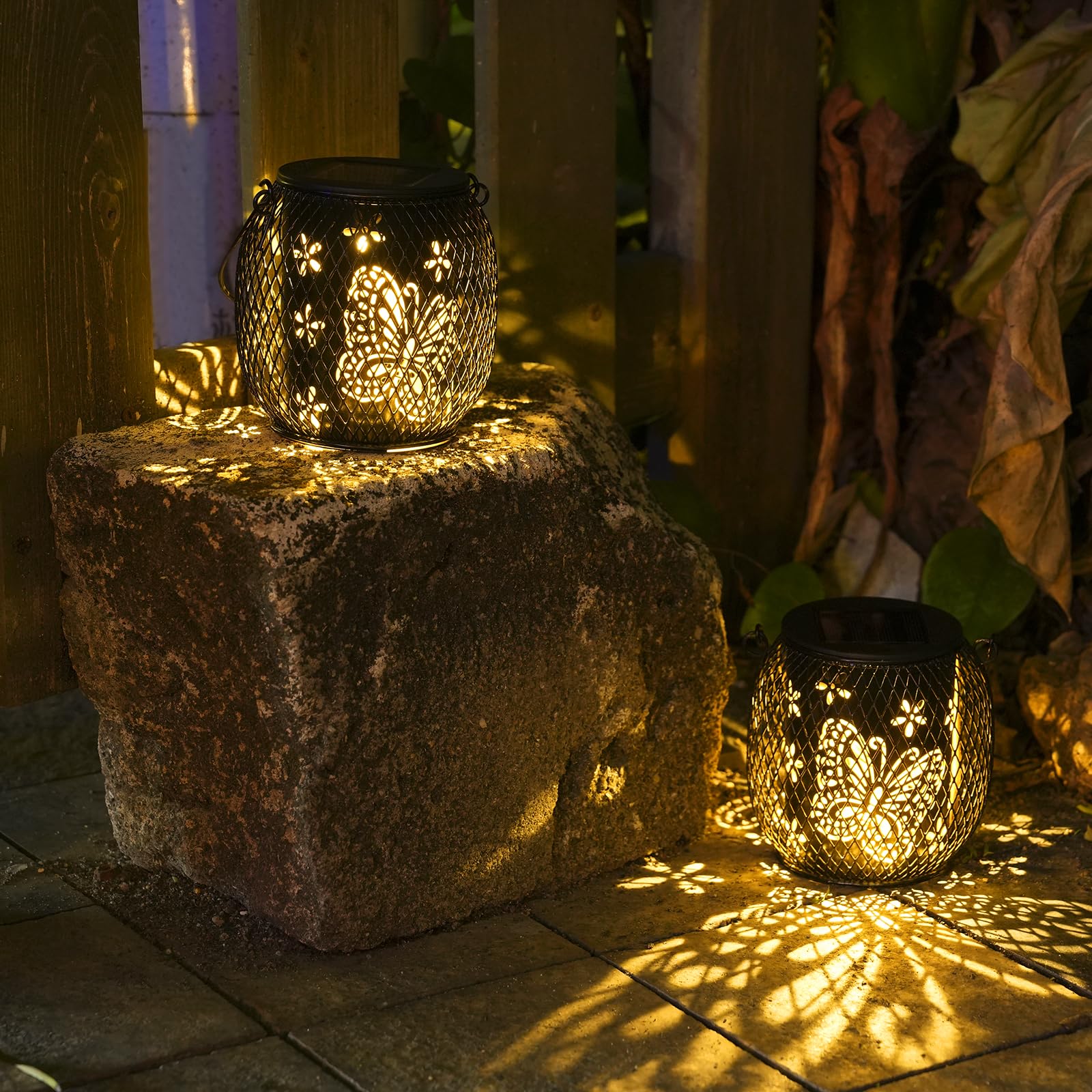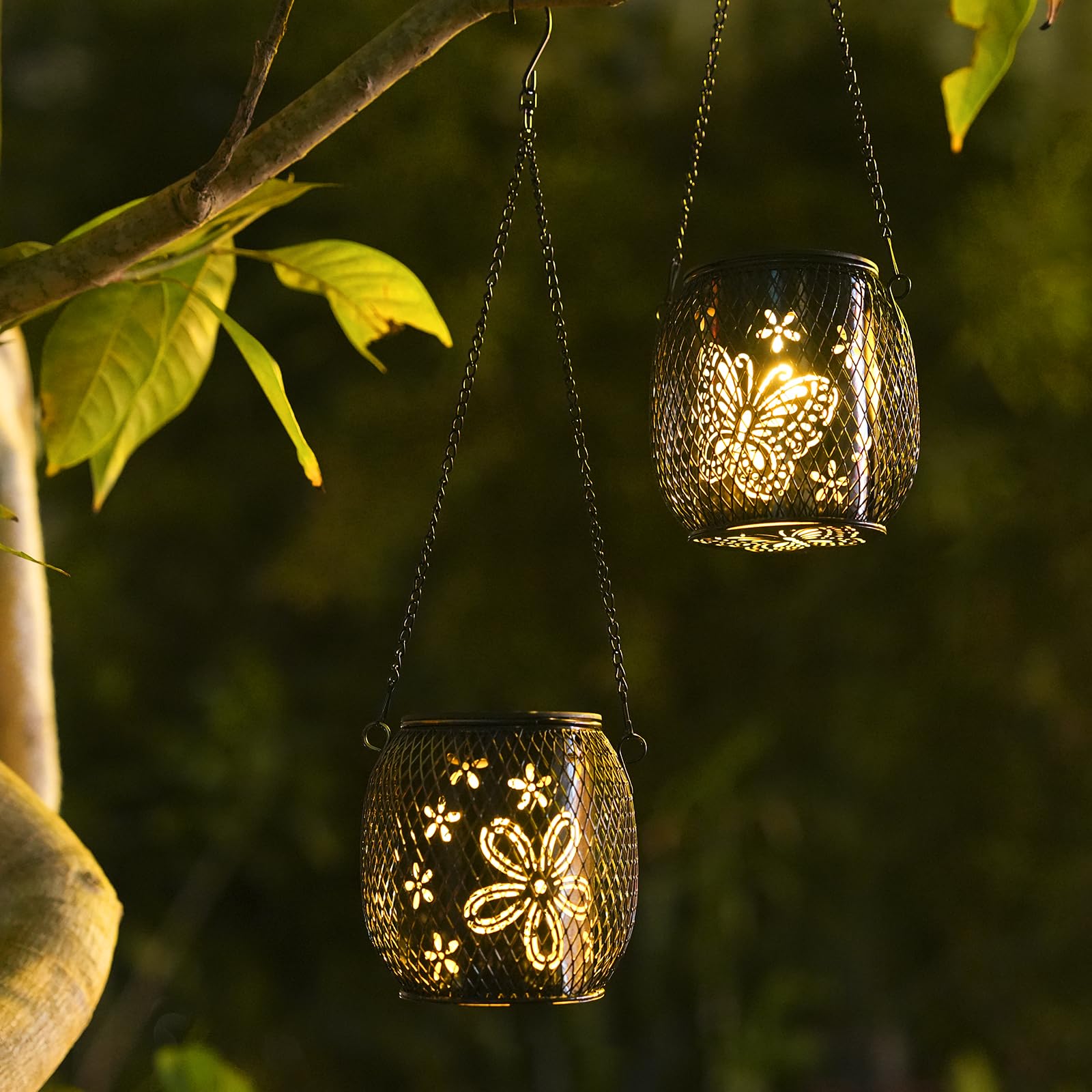 Neoglint Butterfly Solar Lanterns Light, 2 Pcs Outdoor Hanging Garden Lights Metal Lamp IP65 Waterproof Garden Ornaments Lantern Lights for Patio Yard Garden Lawn