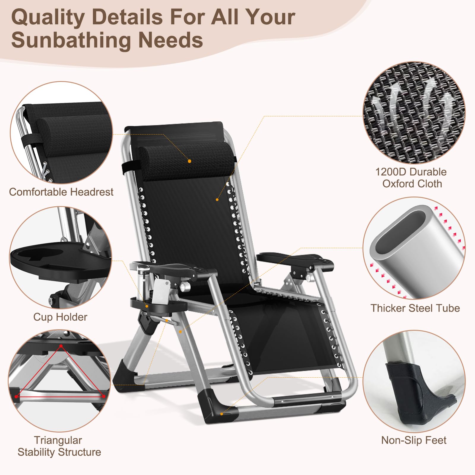 Obqer Folding Zero Gravity Chair, 440LBS Heavy Duty Sun Lounger, Adjustable Garden Recliner with Cushion and Side Holder, Extra Wide, No Assembly Required, Sun Loungers for Garden Terrace Beach Pool