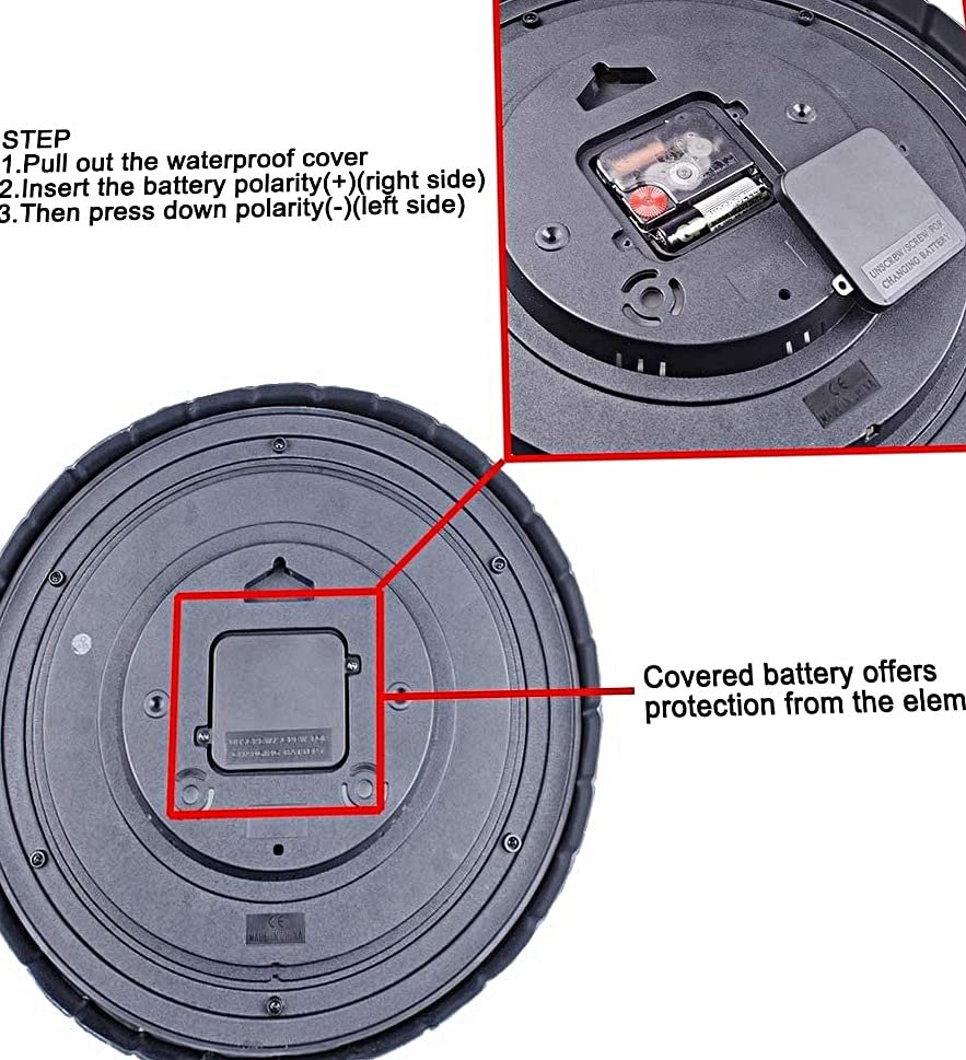 - Large Display Clock: Big 13 inch quartz wall clock(Not 13 inch dial) make it easy to see from any corner of your pool, garden, patio, den, living room, or office. Sturdy plastic frame and Flat glass lens, makes it easy to clean and keeps dust away from the clcok