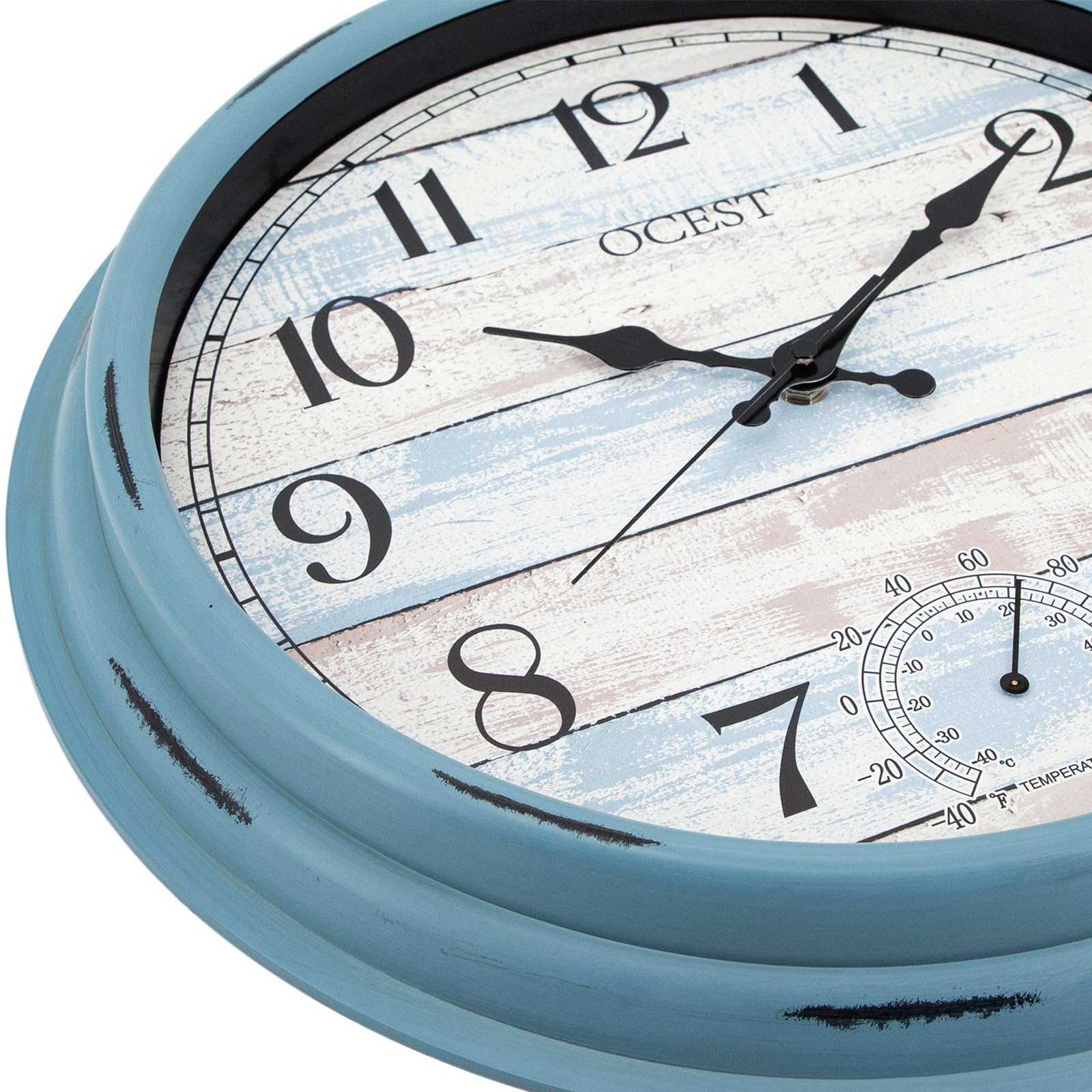 - Elegant Blue Ocean Design: The clock features a subtle wood grain frame and a light blue clock face that adds a refreshing touch to your decor. Its elegant, minimalist design complements a variety of styles, It's suitable for patio, garden,pool,porch,backyard ,laundry room,fence, lanai, garage, farmhouse, bathroom etc
