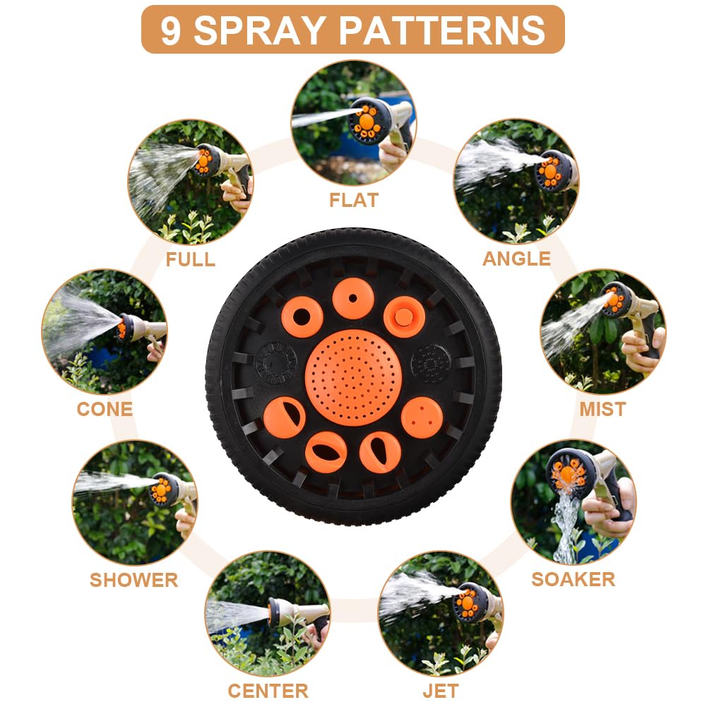 - 【9 Watering Modes】Our garden hose spray gun can achieve 9 water flow modes of full, flat, angle, mist, soaker, jet, center, shower, cone by rotating the spray head to meet your various needs Watering needs. With different mode functions, it can greatly improve your gardening or washing efficiency. Adjust the nozzle first, then press the front wrench to get the effect you want.
