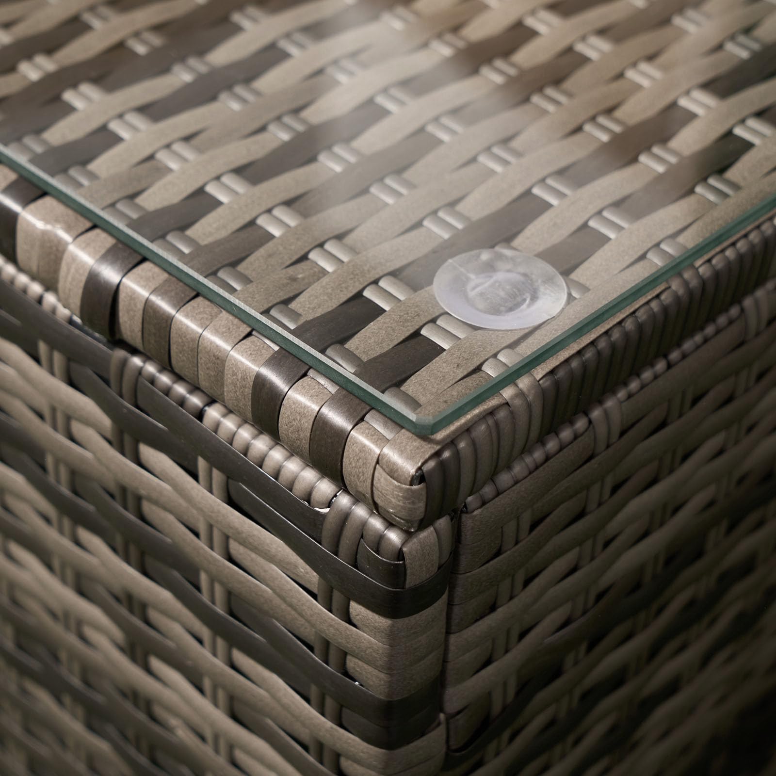 - Functional small outdoor table provides a stylish and practical rattan side table featuring a tempered glass top. Ideal for holding drinks, snacks, or decor, making your outdoor lounging experience even more enjoyable.
