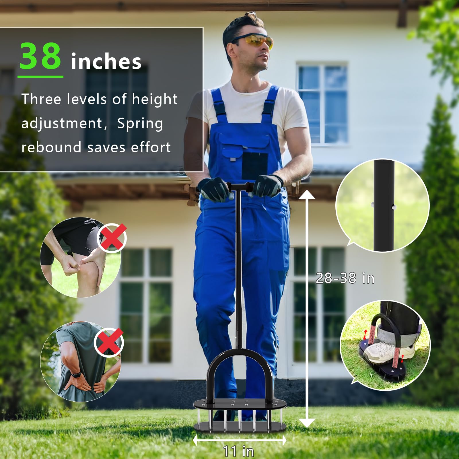 - Ergonomically designed for ease of use: the padded T-handle provides a comfortable, non-slip grip. The footplate is 1.6 inches wide and 0.8 inches thick to easily support your full weight, maximising downward force and keeping your body balanced and safe.The 36-inch patio aerator makes it easy to inflate without back pain.TIPS: If your soil is hard and dry, please water your lawn first so that the yard aerator tool can work best.