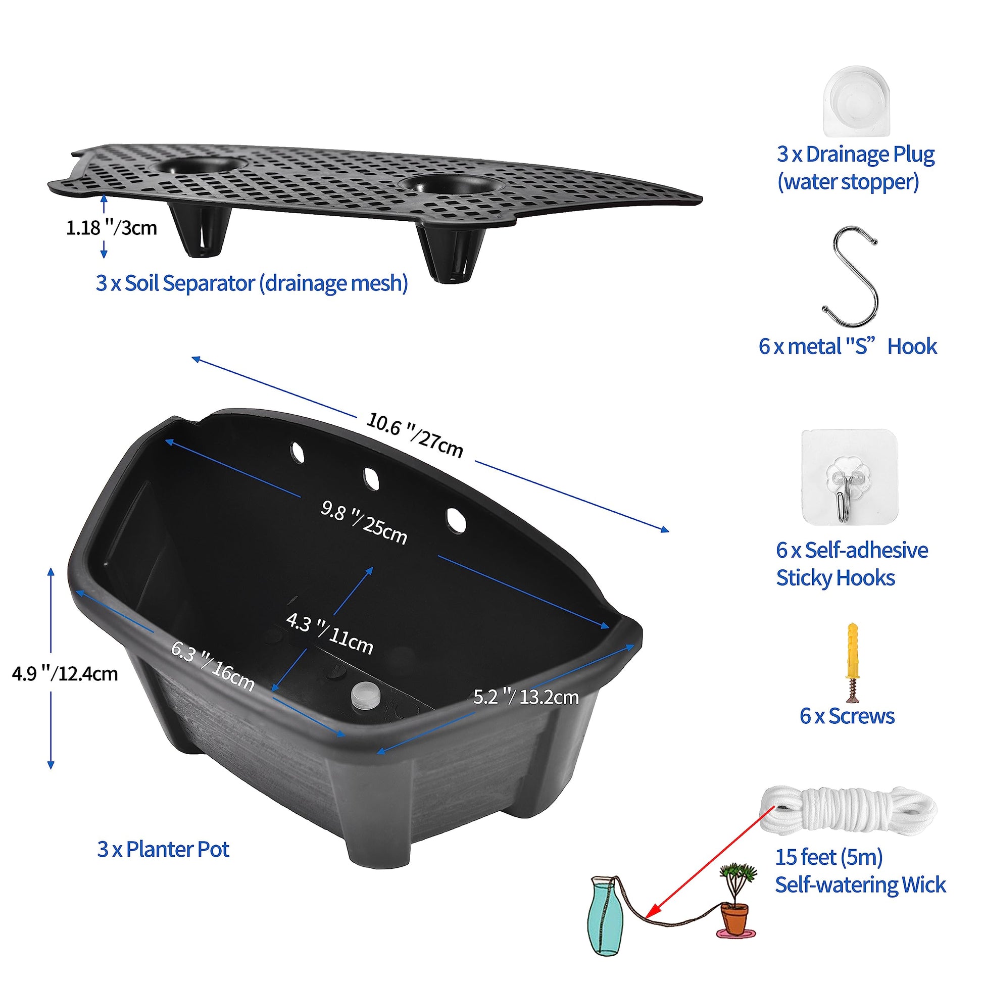- Durable Wall Planter: Flat-backed wall hanging planter made of high-quality durable plastic. Package includes: 3 x wall planter pots - 3 x drainage tray - 3 x drainage hole plug - 15 feet self-watering wick cord- 6 x S-hooks - 6 x adhesive hooks - 6 x screws with anchors. Great value gift for family and friends. Size (L*W*H): 9.8"x4.3"x4.9".