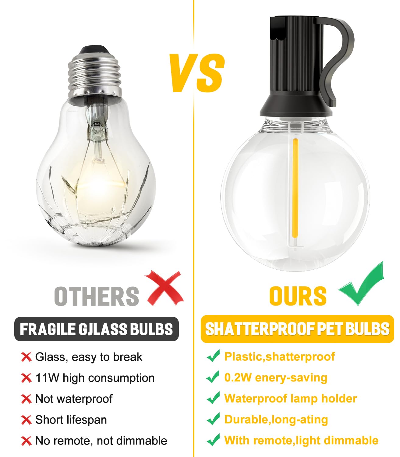 - [IP44 waterproof & Shatterproof] G40 patio lights string are made of high-temperature resistance and shatter-resistant plastic that won't break into dangerous glass shards even if the bulb falls to the ground. IP44 waterproof rating is specially designed for outdoor use, which can effectively prevent rainwater from entering, use it outdoors with peace of mind.Combines practicality with aesthetic flexibility for diverse occasions.