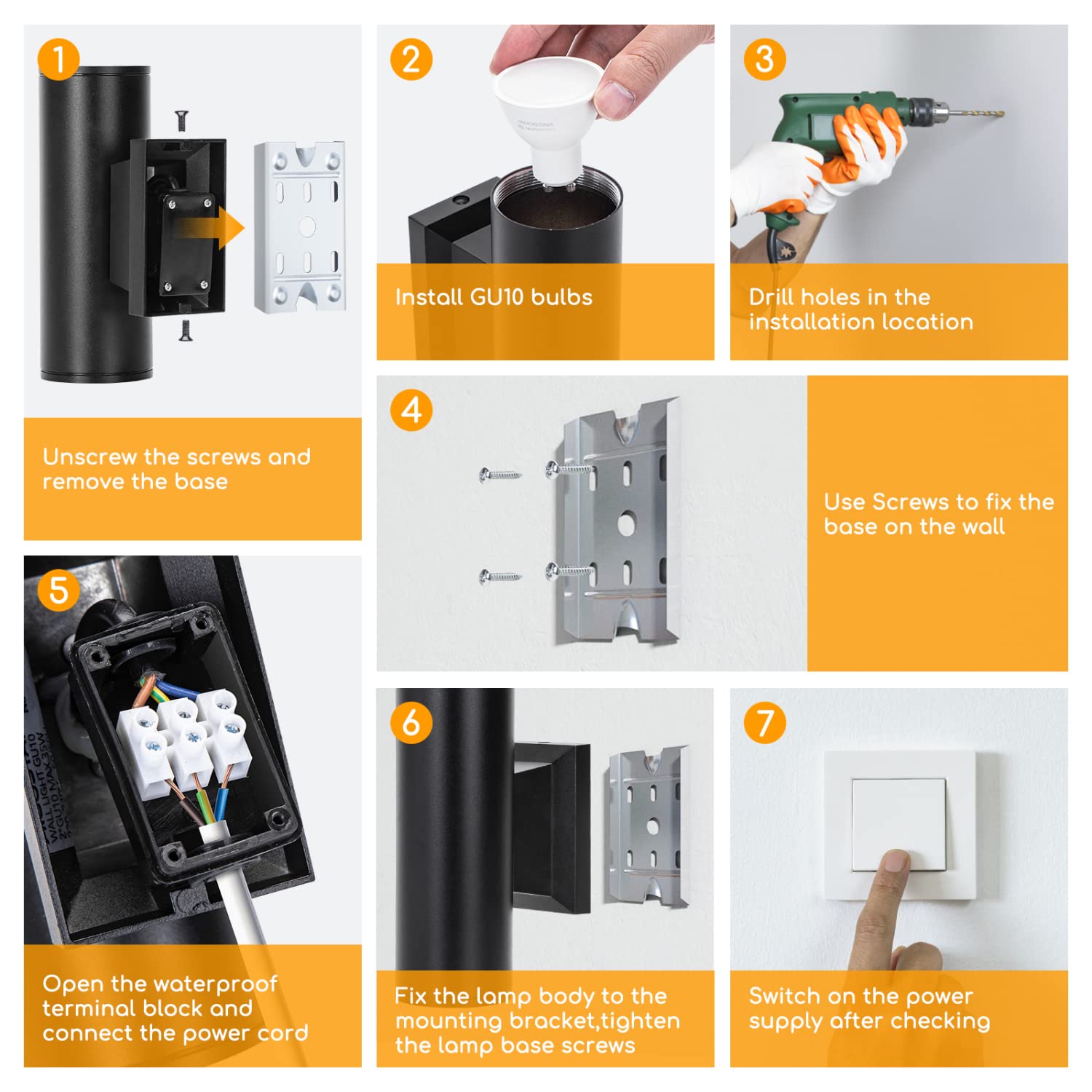 - Easy Installation: Easy to install the up down light. Putting bulbs in first, wall mounting with screws and connect the cable directly, Complete, turn on. Really quick to install. It’s also safe and easy to open it up and change gu10 bulbs.