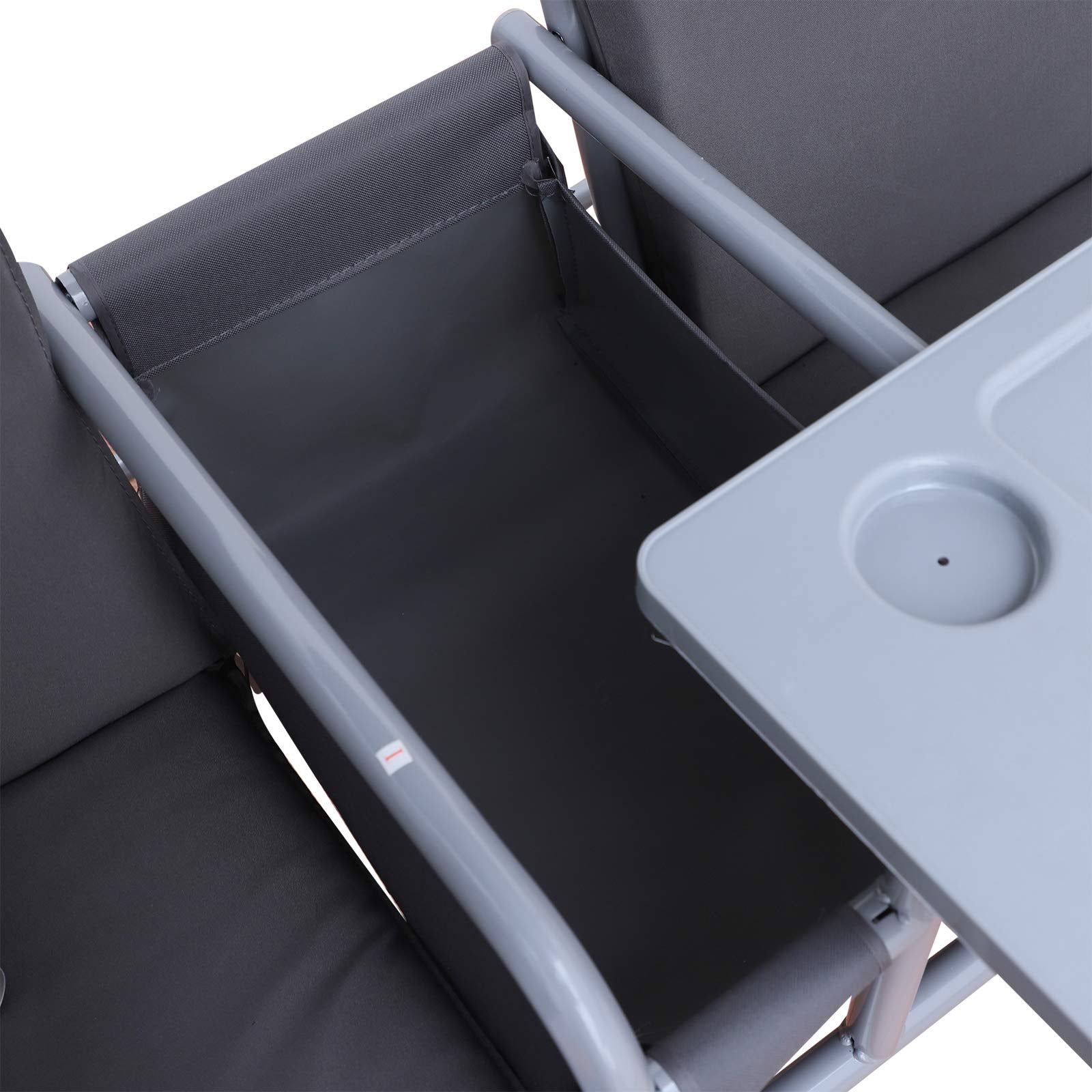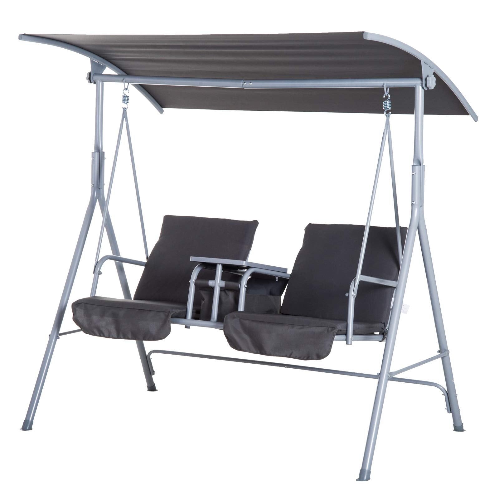 Outsunny 2 Seater Garden Swing Chair Patio Rocking Bench w/Tilting Canopy, Double Padded Seats, Storage Bag and Tray, Grey