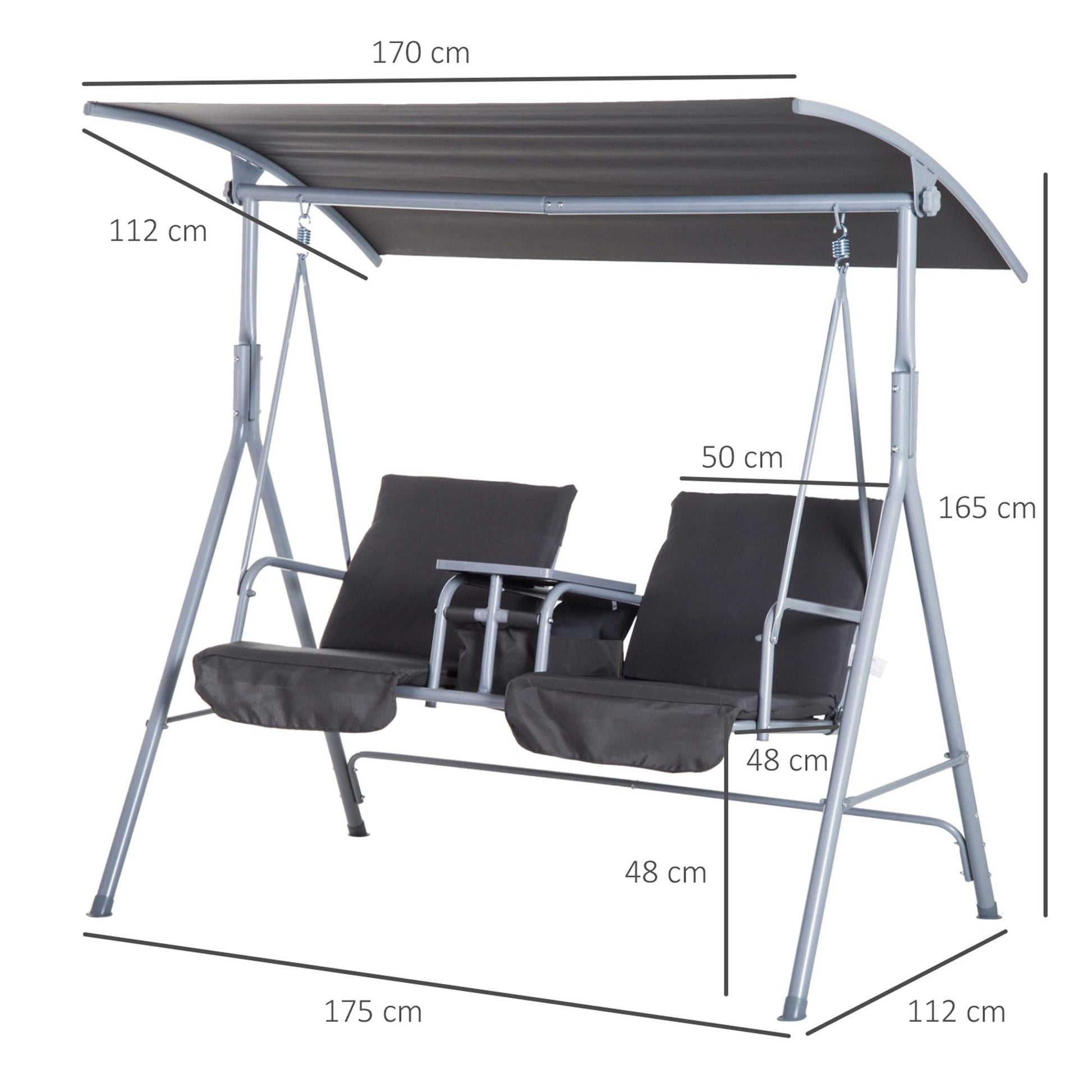 - DIMENSIONS: 175L x 112W x 165H cm. Canopy: 170L x 110Wcm. Swing Chair Outdoor Seat: 50L x 45W x 48H cm. MAXIMUM LOAD 180KG. ASSEMBLY REQUIRED.