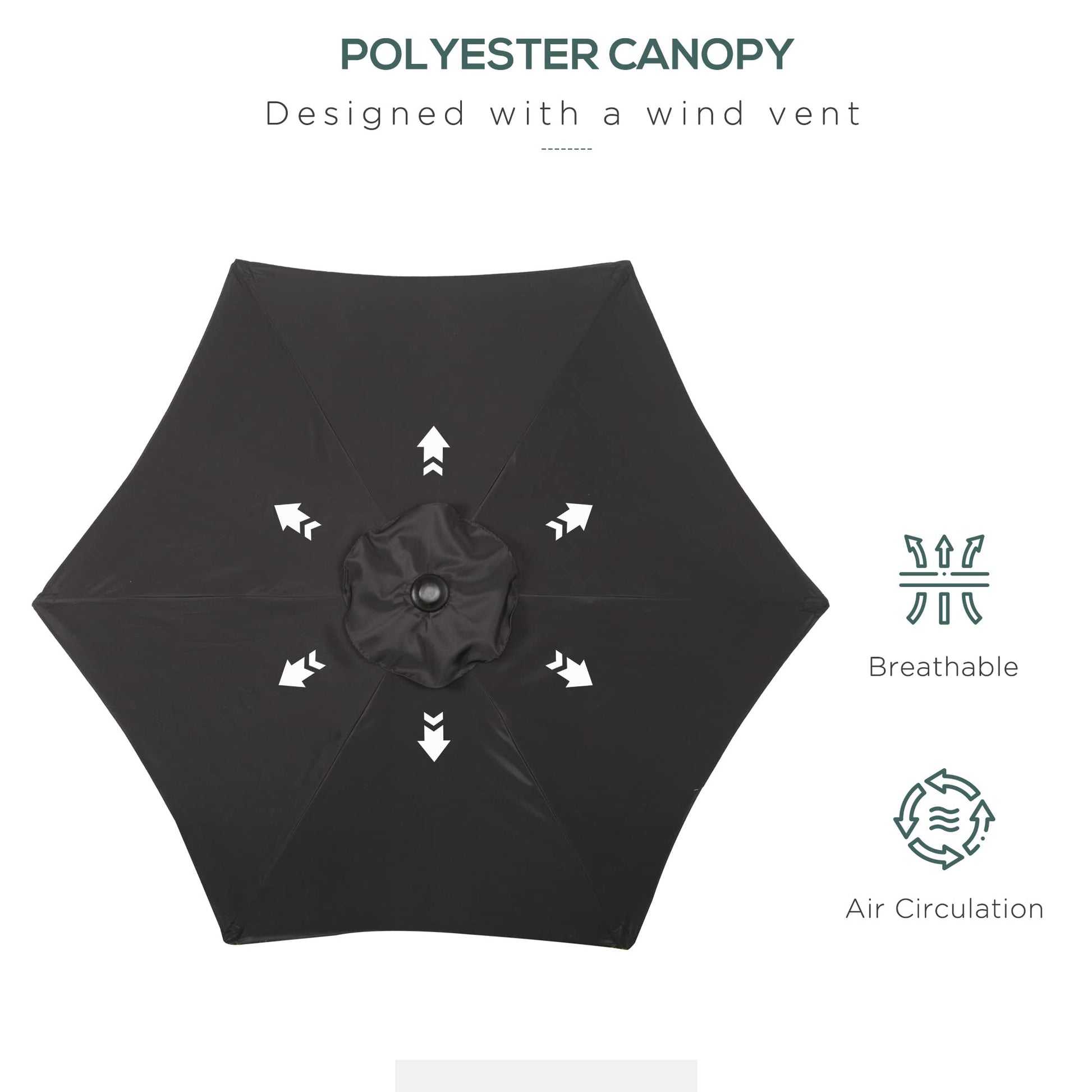 - Aluminium pole: Powder coated for patio parasol's extra strength, a strong core to stand steadily and upright. Six ribs connect to the canopy for extra strength.