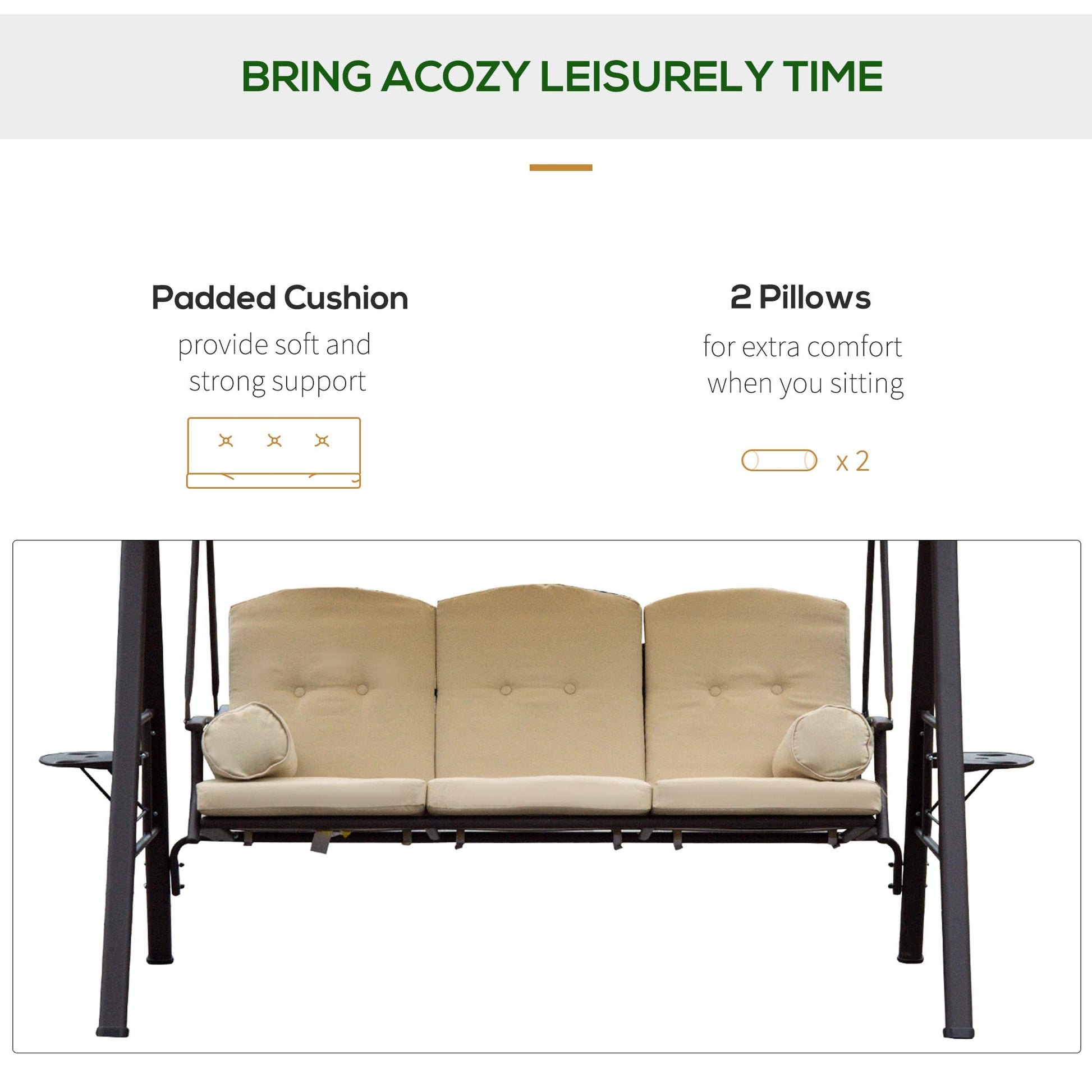 Outsunny 3 Seater Garden Swing Chair Outdoor Hammock Bench w/Adjustable Canopy, Cushions and Cup Trays, Brown Steel Frame, Beige Fabric
