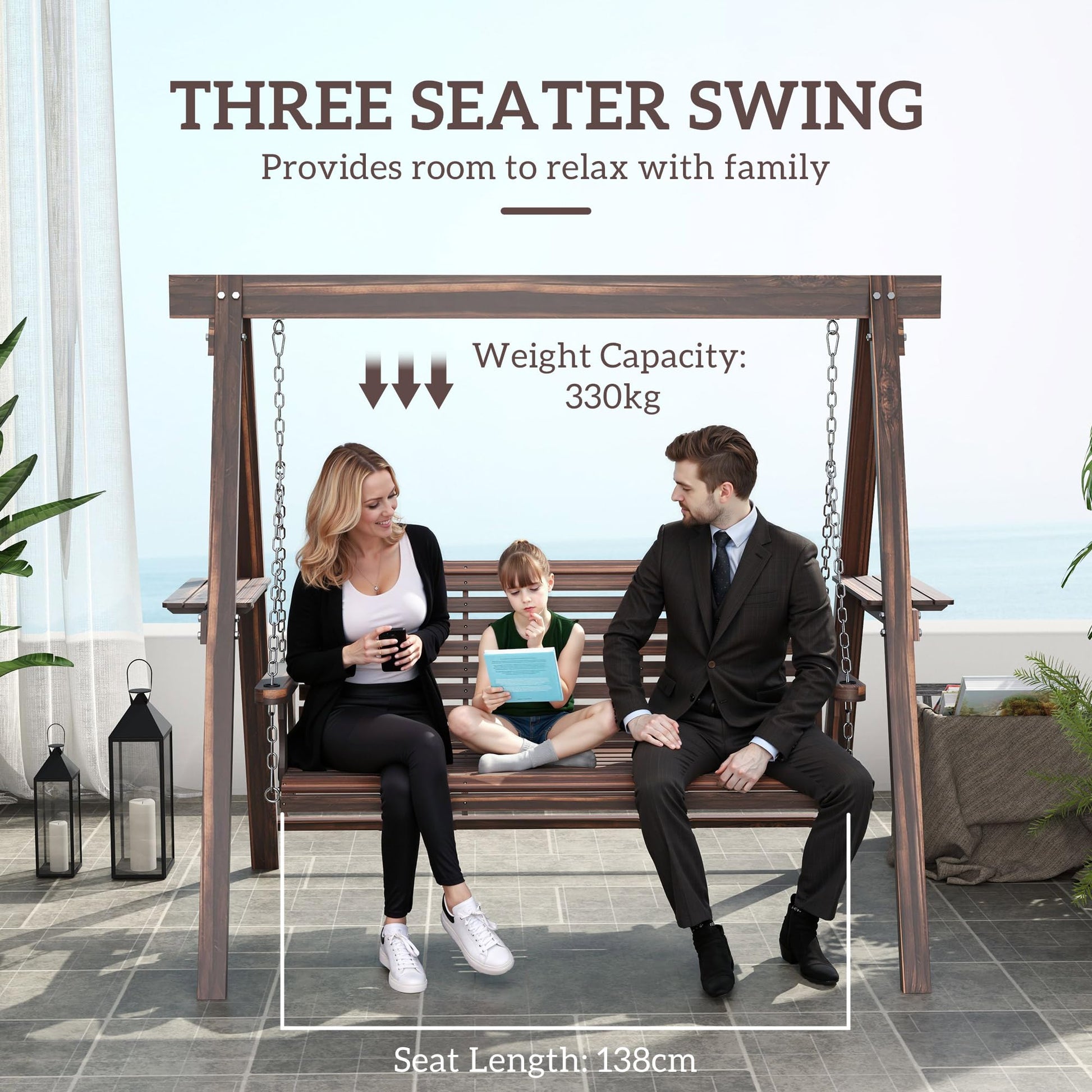 Outsunny 3 Seater Garden Swing Seat, Wooden Swing Chair Bench with Side Tables and Metal Chains, for Outdoor Porch Patio, Carbonised Brown