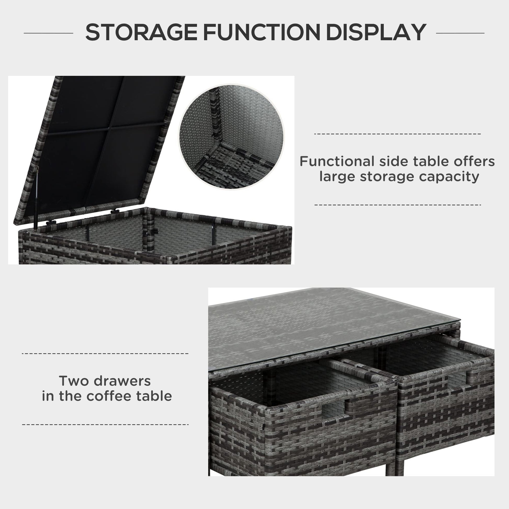 - MULTIPLE STORAGE COMPARTMENTS: A placed in the tall corner table, and two drawers in the coffee table of the rattan garden furniture – giving you lots of storage room within easy reach, allowing you to keep the area clean and tidy. THICK CUSHIONS: Placed on the seats and backs of the corner garden furniture and so you can sit comfortably all day long. Machine washable covers are resistant to light water and stains.