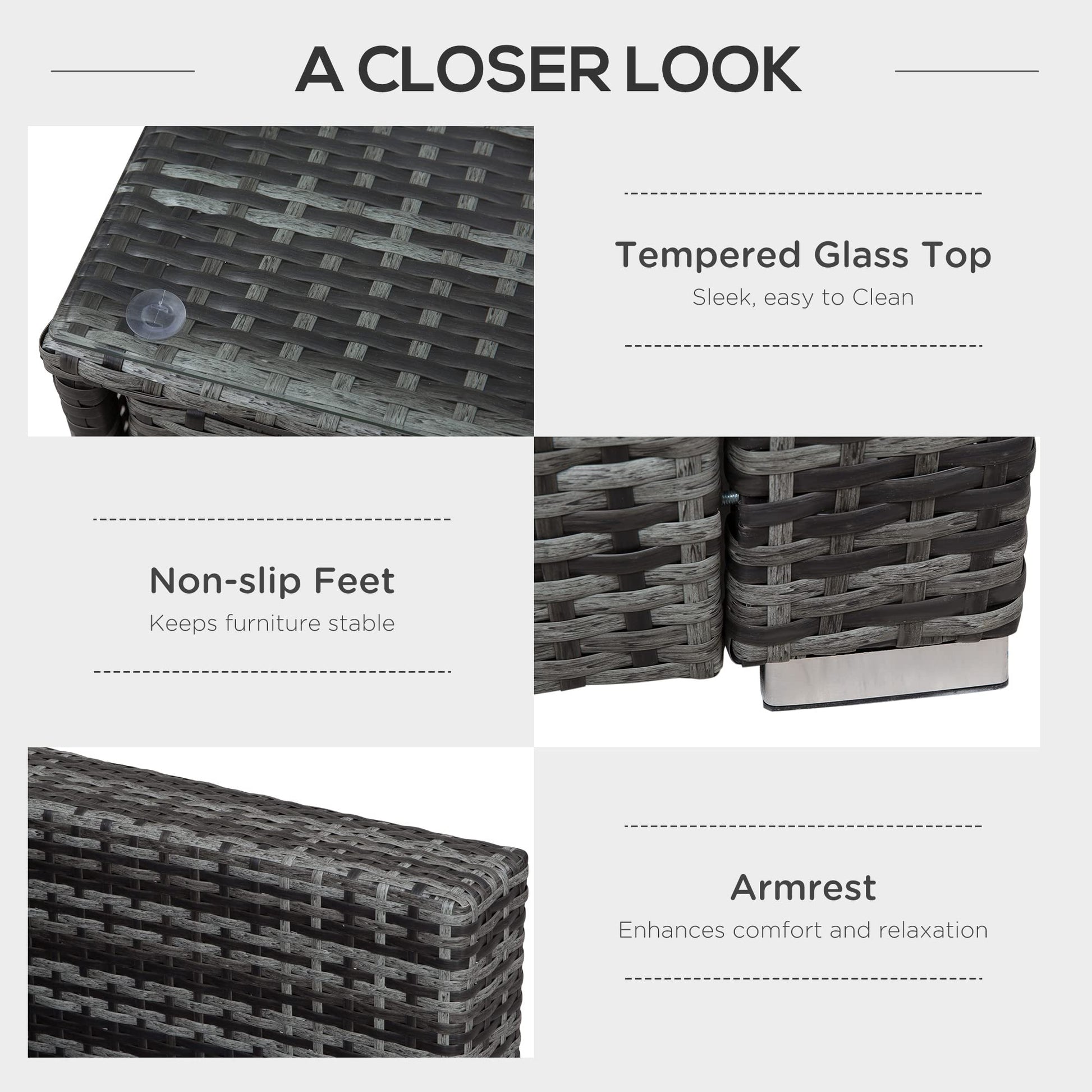 - TEMPERED GLASS TABLETOP: The glass tabletop of the garden rattan furniture sets add a sleek finishing touch which is also easy to clean and maintain. DIMENSIONS: Sofa: 66H x 134W x 75Dcm. Tall storage table: 67H x 76L x 76Wcm. Coffee table: 36H x 100L x 60Wcm.