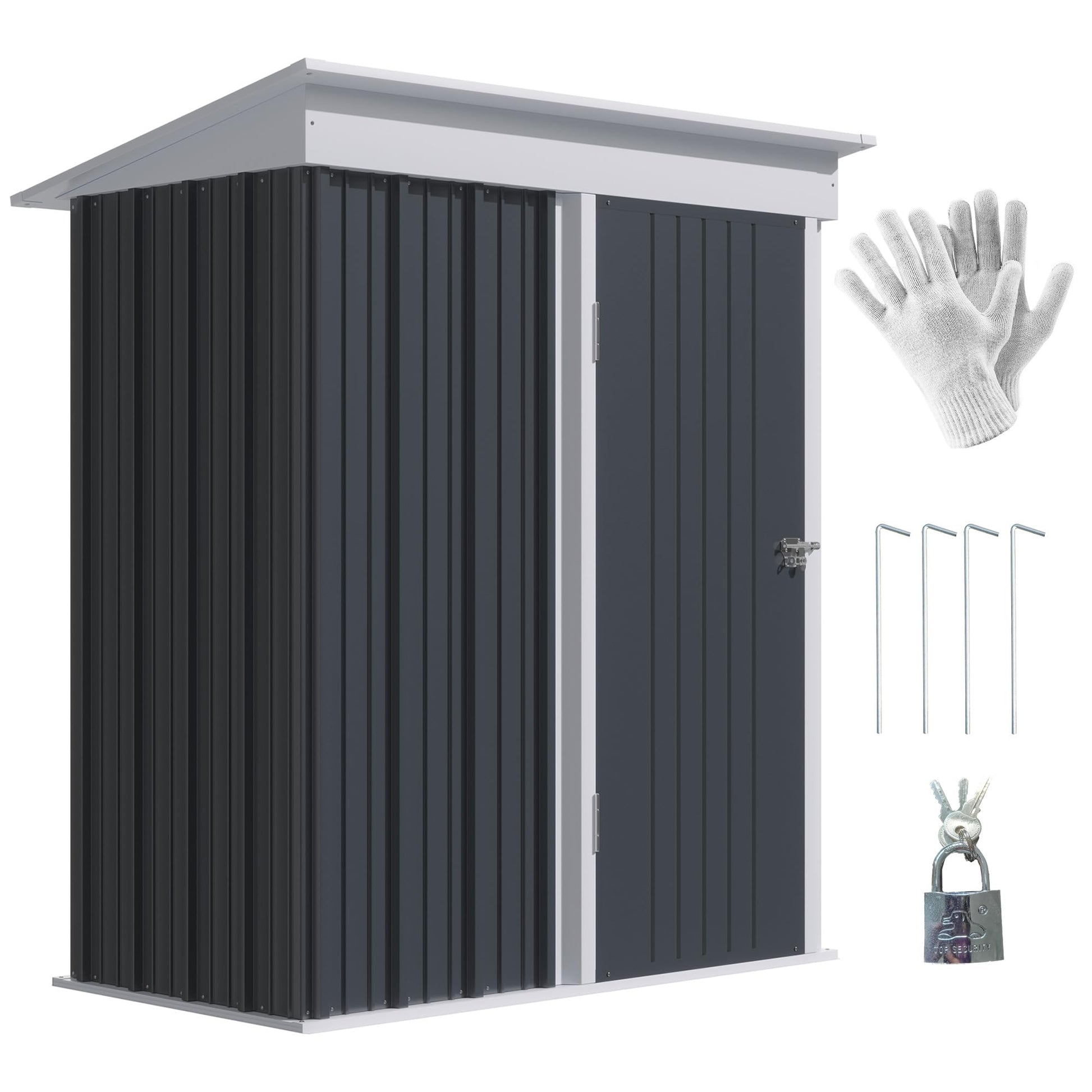 Outsunny 5x3ft Garden Shed, Steel Small Shed, Outdoor Lean-to Shed with Adjustable Shelf, Lock and Gloves for Patio, Garden, Dark Grey with Foundation Kit