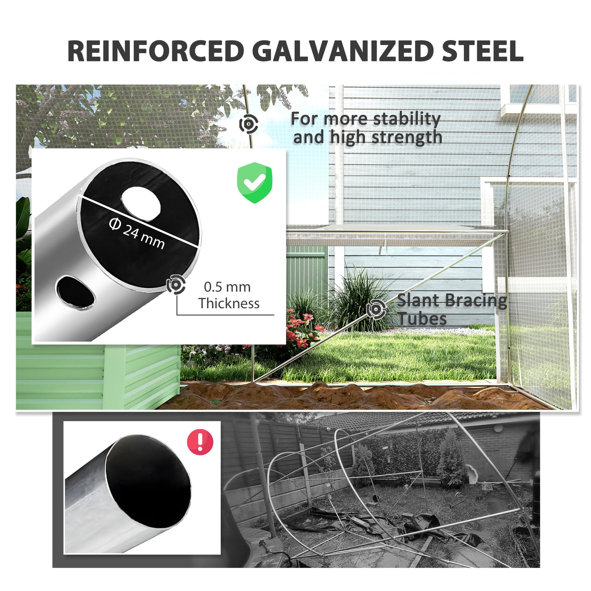 - Solid structure: Equipped with a 24 mm galvanised steel frame, slant bracing tubes, ground stakes and guy ropes to ensure stability in your garden polytunnel