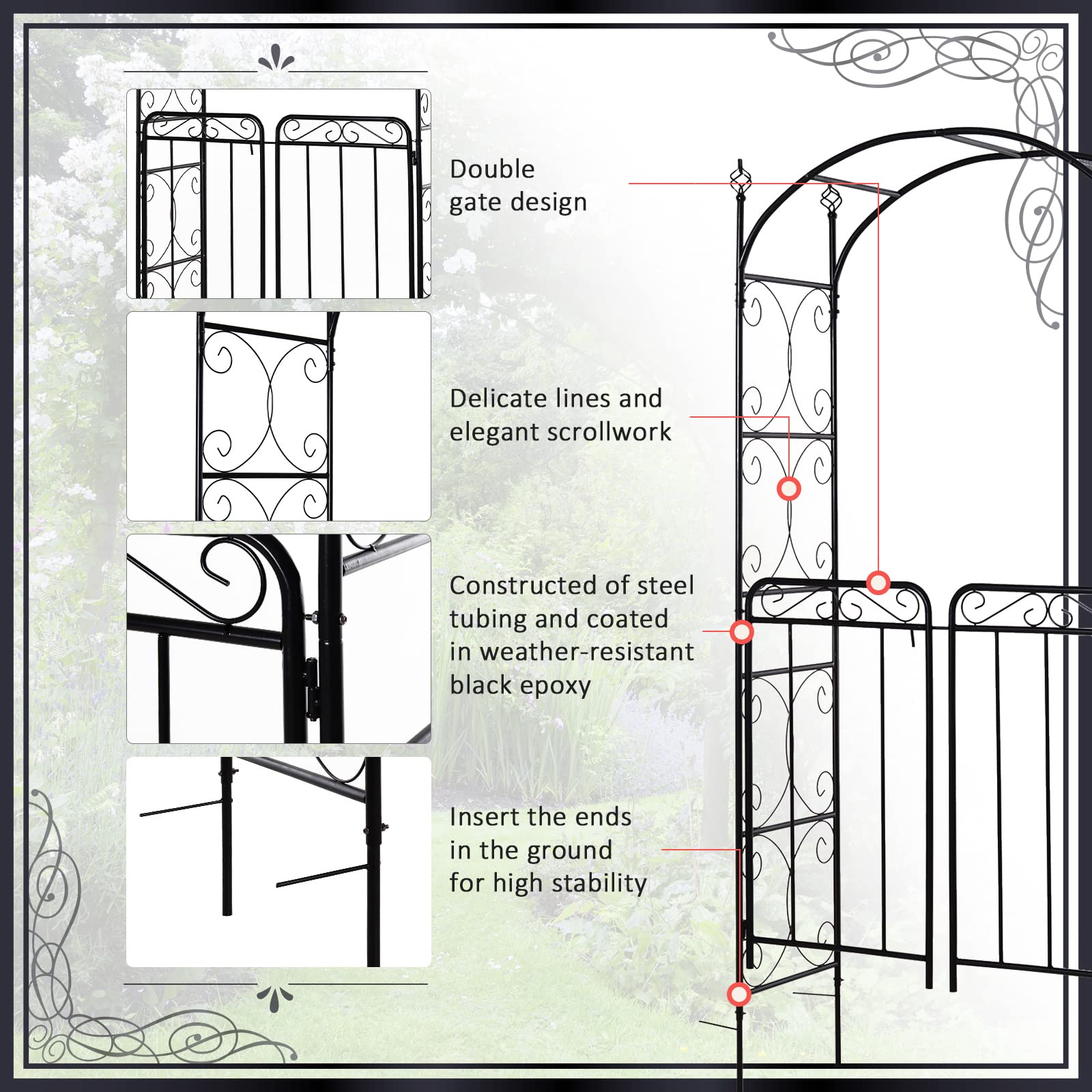 Outsunny Garden Decorative Metal Arch with Gate Outdoor Patio Trellis Arbor for Climbing Plant Archway Antique Black - 108L x 45W x 215Hcm