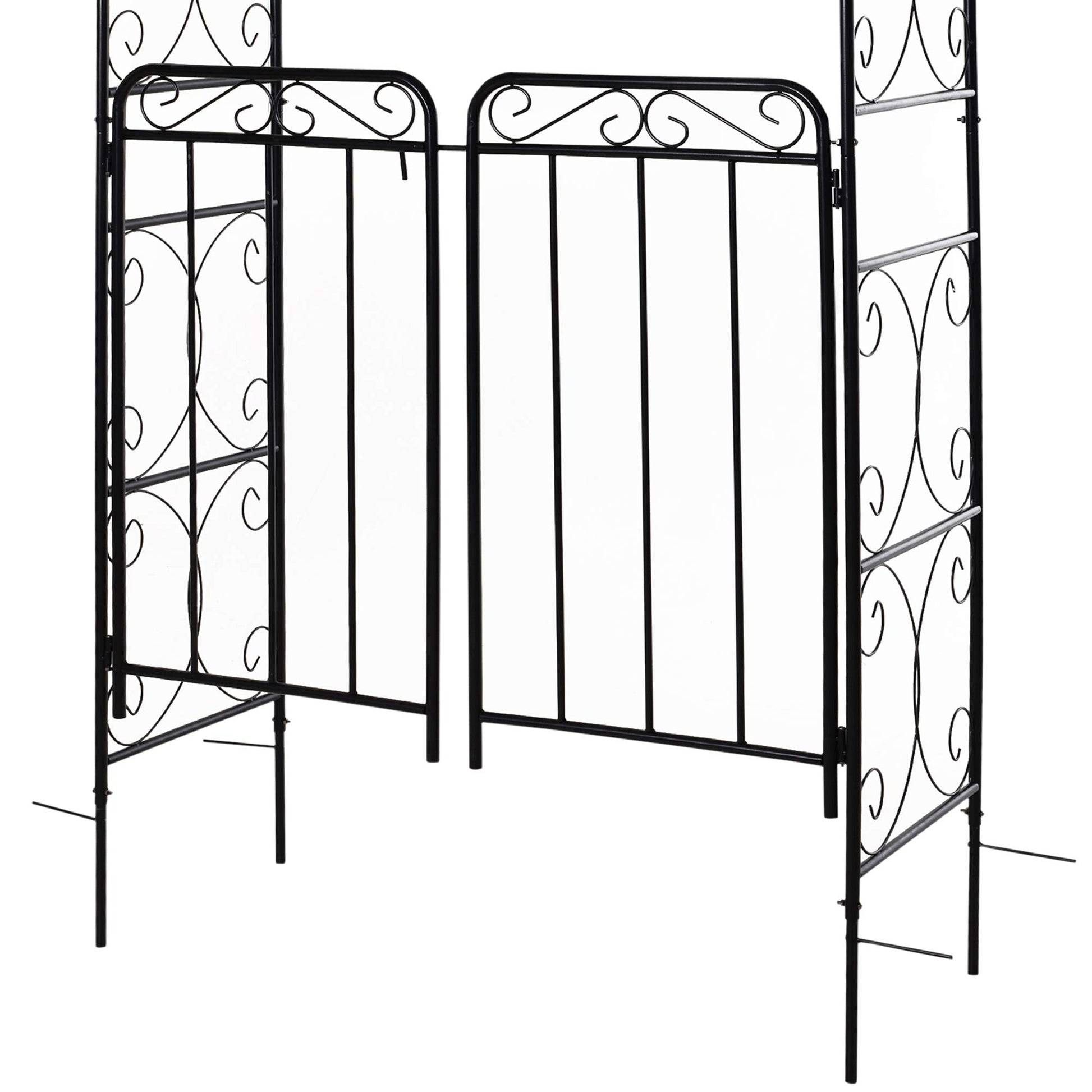 - METAL FRAME: The garden arch with gate has a durable and tough structure, with a matte black powder coating for extra strength. SPIKED FEET: Sharp ends for you to spike frame in the ground, with horizontal bars to stop it sinking into the ground.