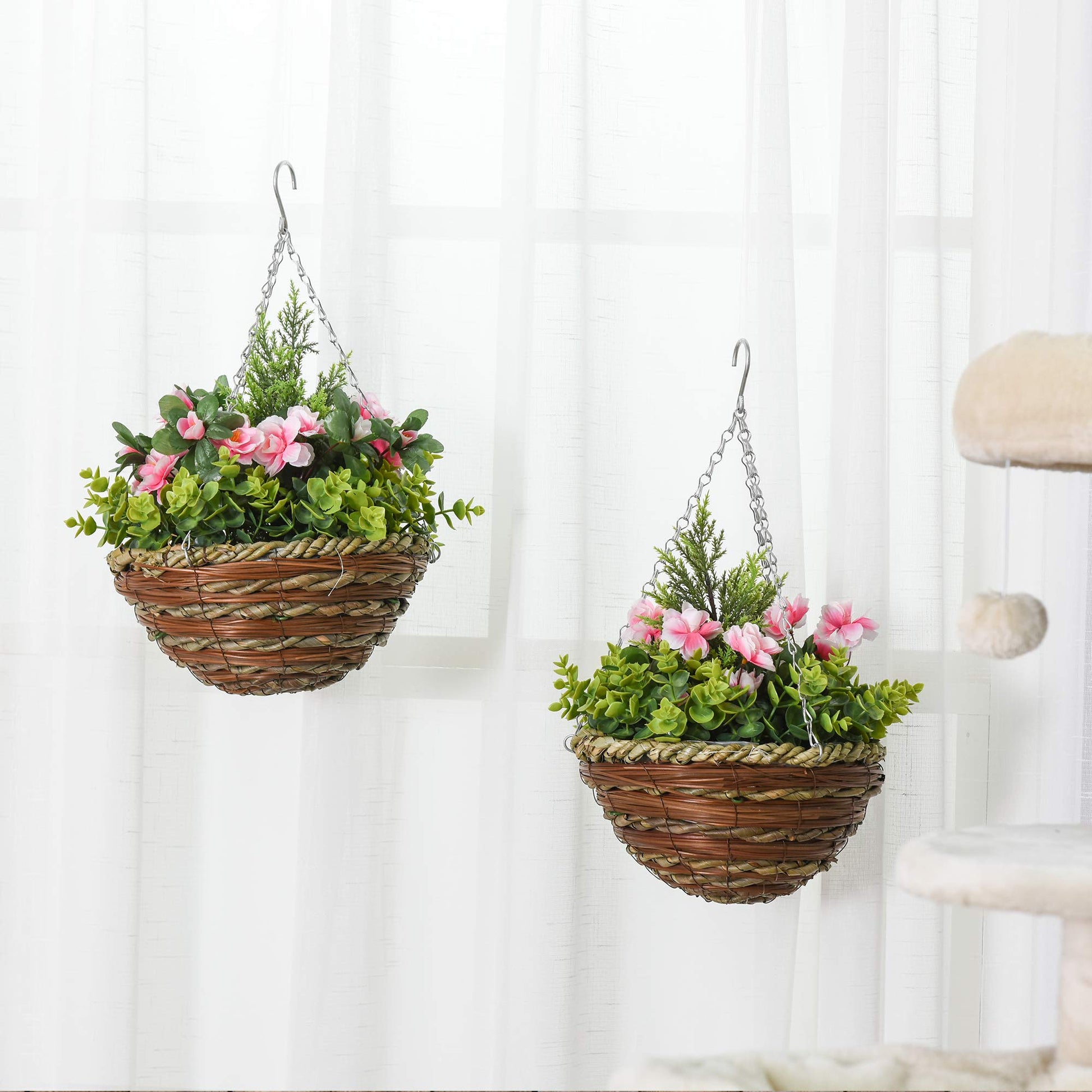 Outsunny Pack of 2 Artificial Lisianthus Flowers Hanging Planter with Basket for Indoor Outdoor Decoration