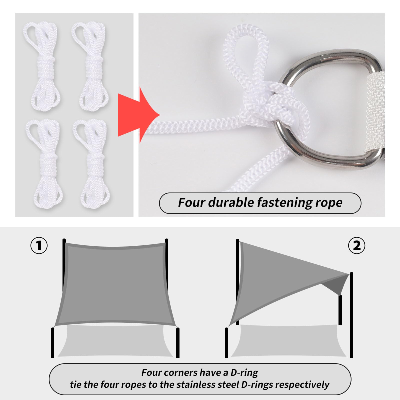 EASY TO INSTALL: each corners have a D-ring, you can successfully install the shade sail by simply hanging each corner on the hook.Or tie the ropes to the stainless steel D-rings respectively, then fix the other end in the required, straighten the rope.