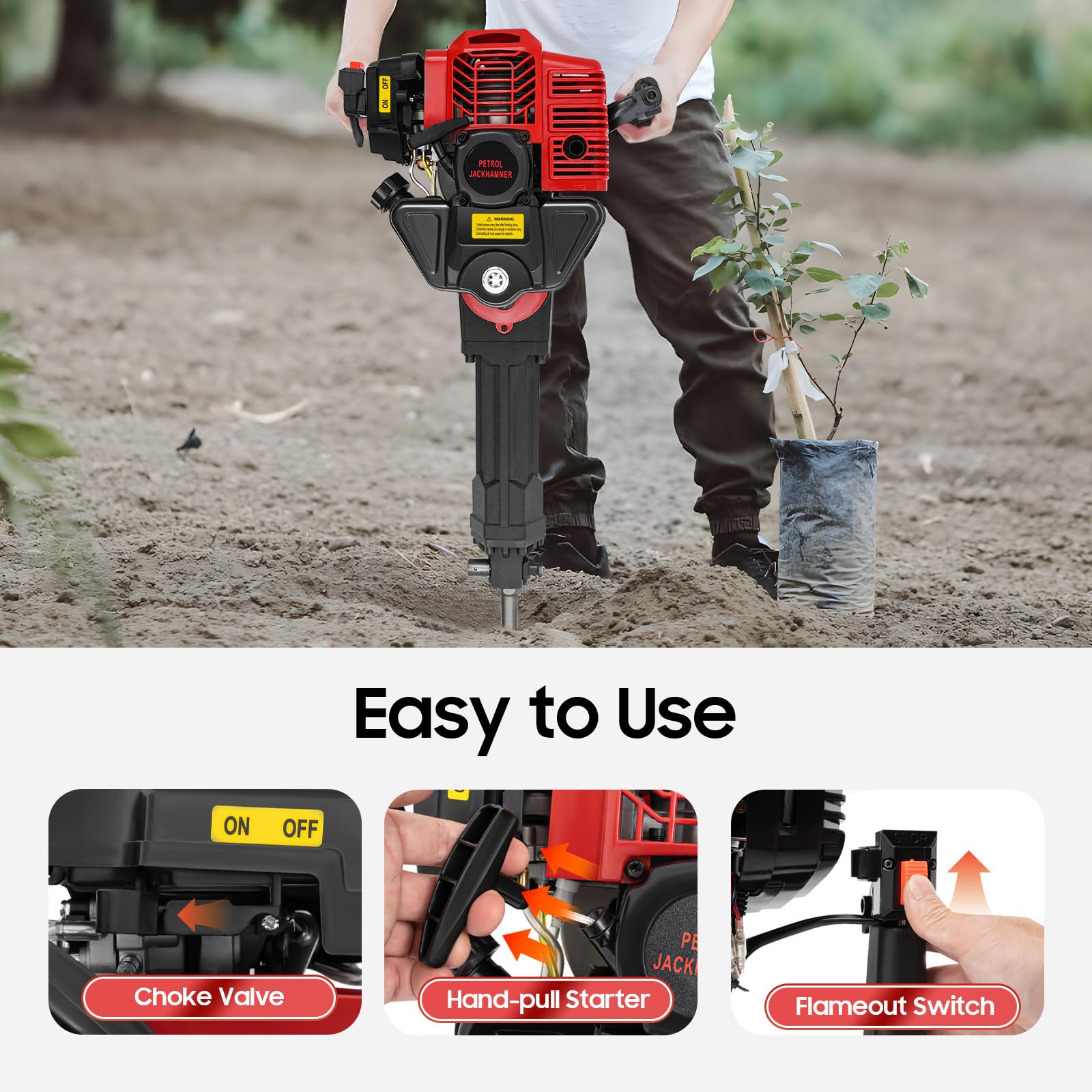 Petrol Garden Tree Digger,52cc 2 Stroke Excavator Digging Machine,1900w 6500r/min Post Hole Digger mit Wide Shovel&Pointed Pickaxe&Flat Pickaxe,Handheld Trencher Digger Machine for Garden and Farm