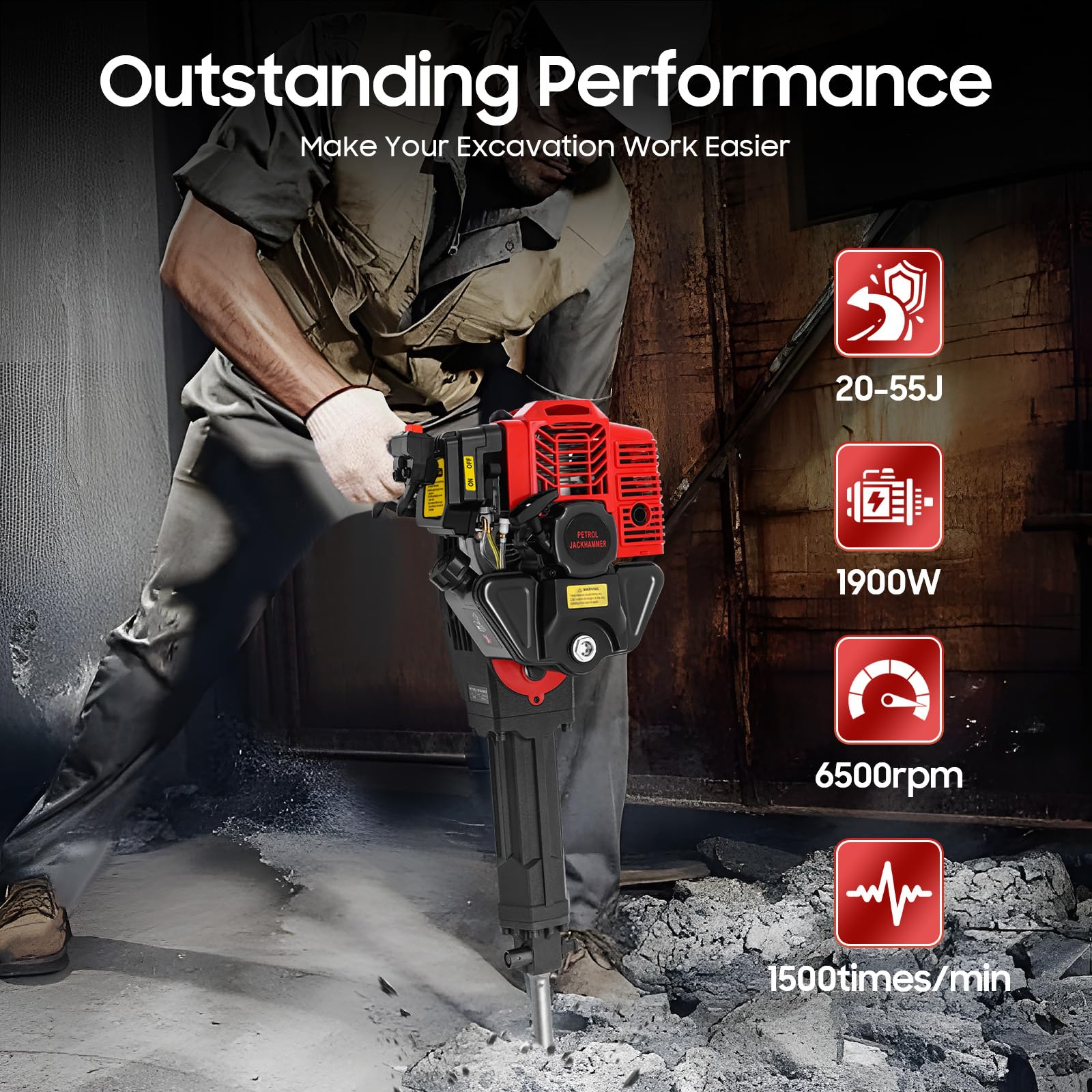 - HIGH EFFICIENCY: With strong power (1900W), it has high speed (6500rpm), impact frequency (1500times/min), and impact energy (20-55J), which can provide it with powerful strength and make your excavation work easier.