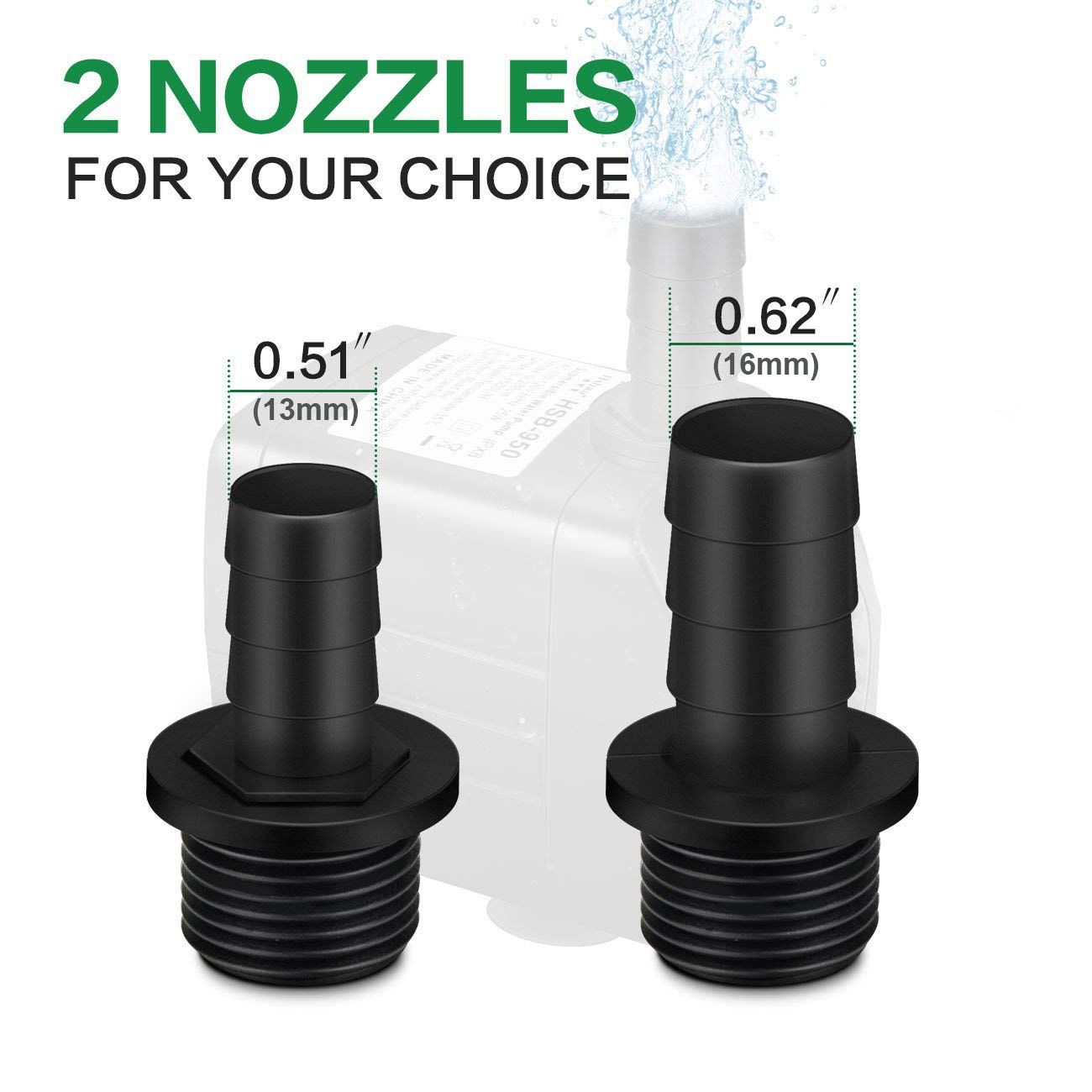 - 【Powerful Speed Flow】-- An adjustable knob to control the water pressure, Max Flow Rate of the sumersible pond pump is 400 Gph per hour(1500L/H), Max Lift Height: up to 6.9ft(2.1m).Equipped with 2 nozzles--13mm,16mm, providing a different water flow as you desired.