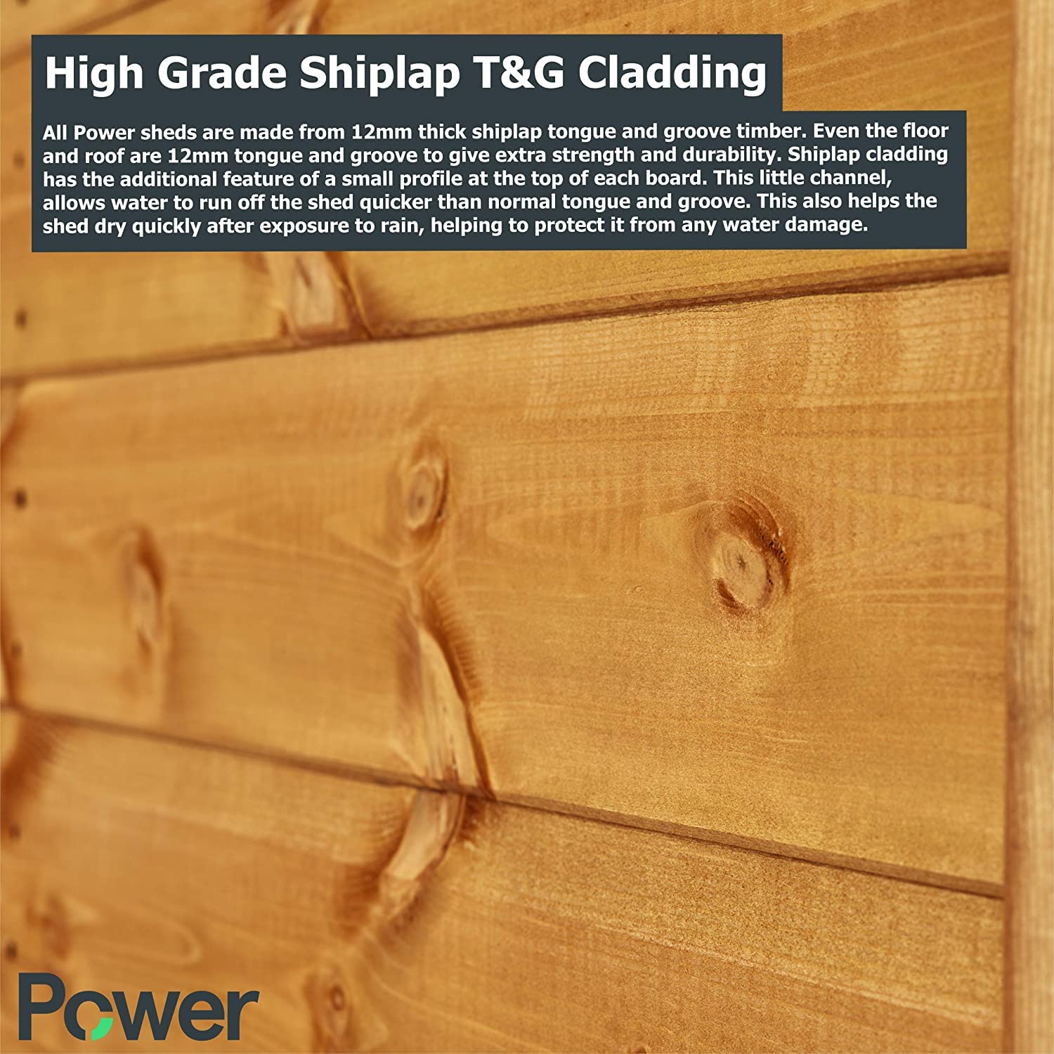 - COMPOSITION: All shiplap sheds have high grade premium standard tongue and groove timber throughout including roof and floor. Our wooden sheds use 12mm extra thick shiplap cladding responsibly sourced in line with our sustainability policy.