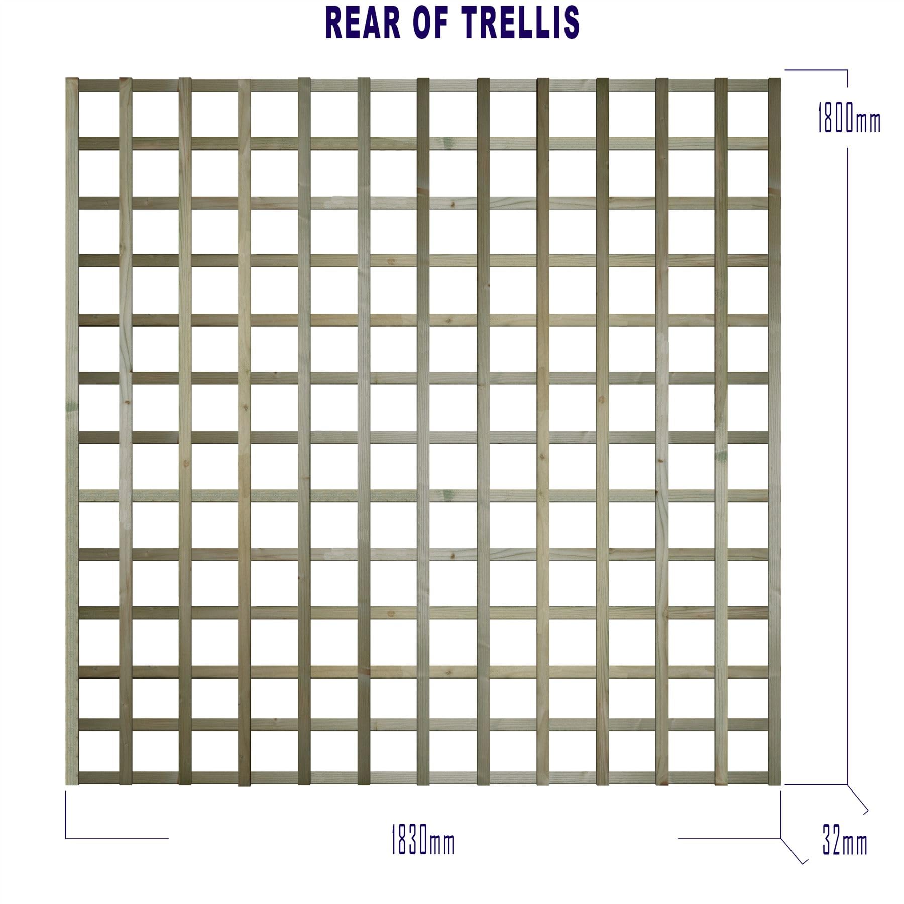 - Product Dimensions Width 6ft (183cm) x Height: 6ft (180cm) The trellis laths used on this product are rough-sawn 32mm x 16mm. The front batons are positioned horizontally along with the rear batons which are positioned vertically. Hand made in our Shropshire UK factory by one of our expert joiners. With the standard design we position the laths to provide squares between 100mm to 120mm in size the squares differ depending on the height purchased.