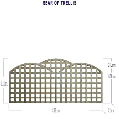 - Our Triple Dome Trellis panels provide you with a beautiful multiple-arched configuration to form a cloud-like top., The advertised measurement is to the shoulder and approximately 26cm should be added to it to achieve the full panel height., We only use pressure-treated tanalised trellis laths which are rough-sawn 32x16mm. , The front laths are placed horizontally and the rear are placed vertically., The two side domes sit approximately 17cm above the shoulder measurement.