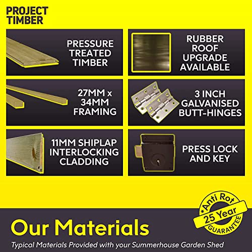 - ✅ LONGER LASTING SUMMERHOUSE - All of our Summerhouses at Project Timber are pressure treated as standard. This gives you a longer-lasting building with extra protection throughout the seasons. They are also lower maintenance compared to dip-treated buildings.