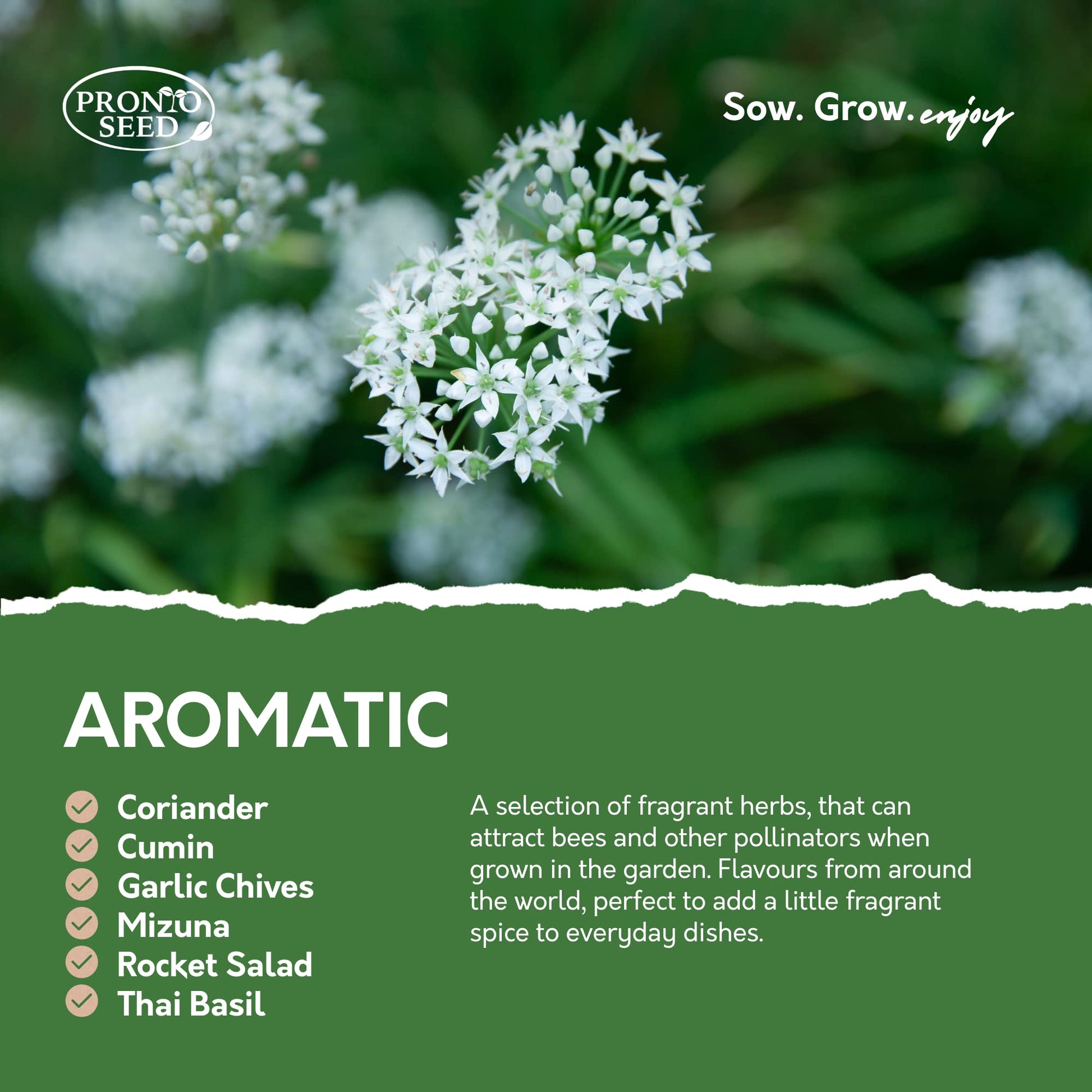 - Aromatic Collection – Add zest to your meals with Coriander, Cumin, Garlic Chives, Mizuna, Rocket Salad, and Thai Basil. This collection offers exotic, aromatic herbs that thrive indoors or out