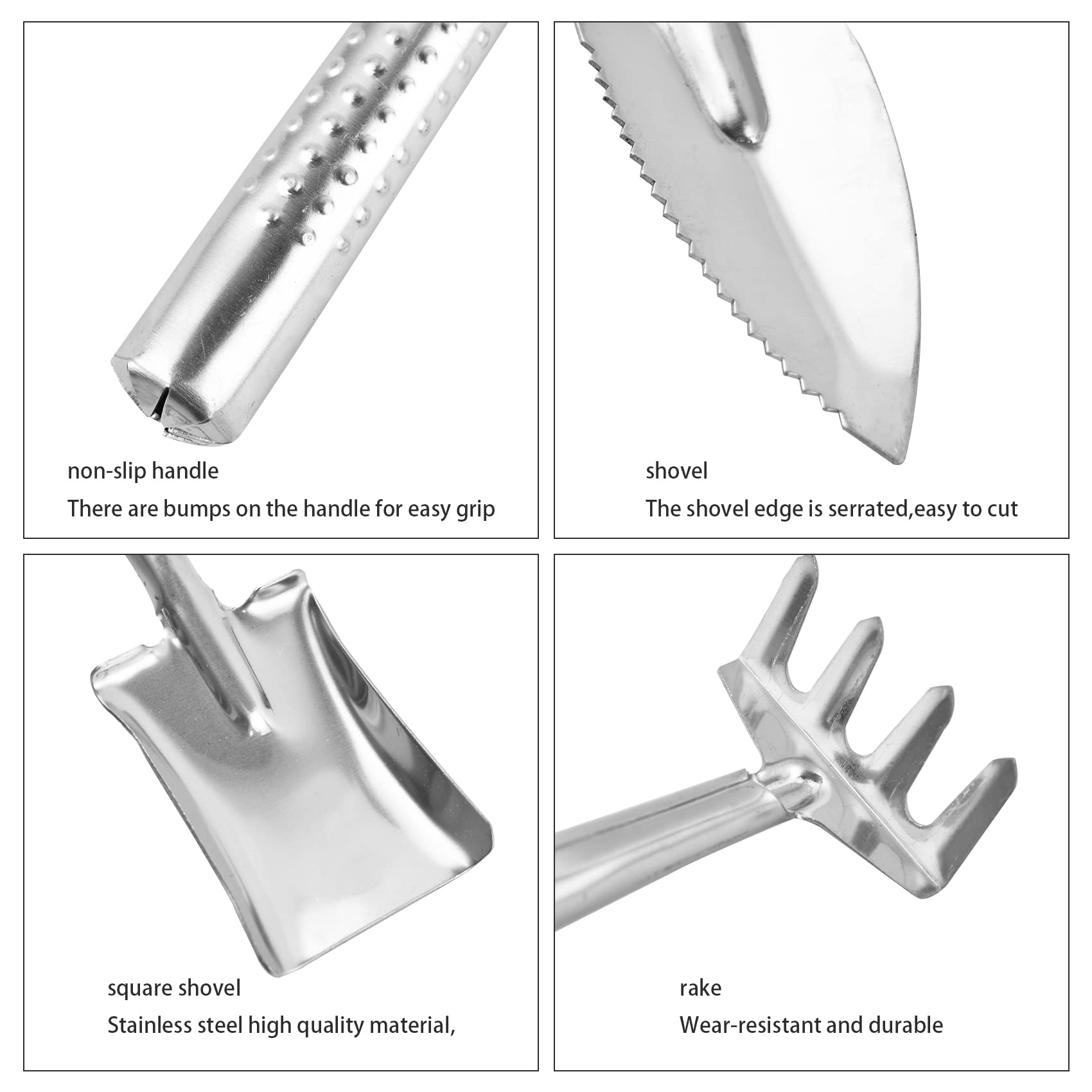 - Mini gardening tools are made of high quality stainless steel which is strong, keep these items from rusting, bending, durable and comfortable to use