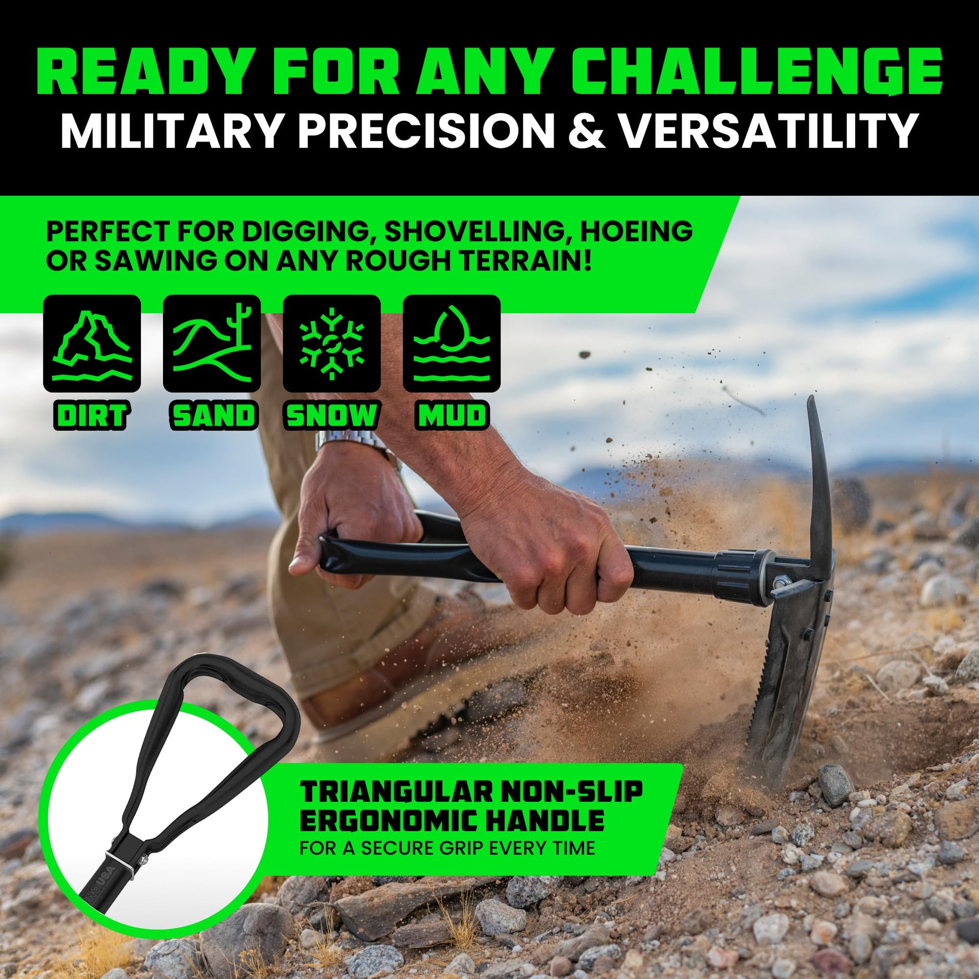 - 3-IN-1 MULTIPURPOSE - Features a Versatile Design With a 180-Degree Shovel, 90-Degree Pickaxe, and 90-Degree Pick hoe, Allowing you to Tackle Various Tasks With a Single Tool.