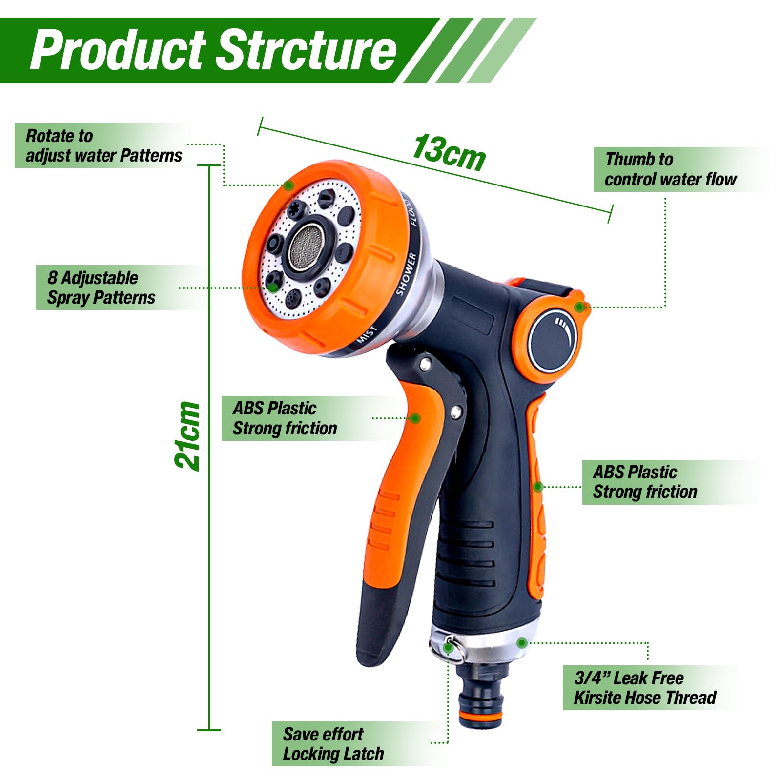 - Adjustable 8 Spray Patterns: Choose from 8 shower spray patterns to fulfill all your watering needs. The adjustable settings provide a range of water pressures, suitable for tasks ranging from patio cleaning to misting delicate flowers in your garden.