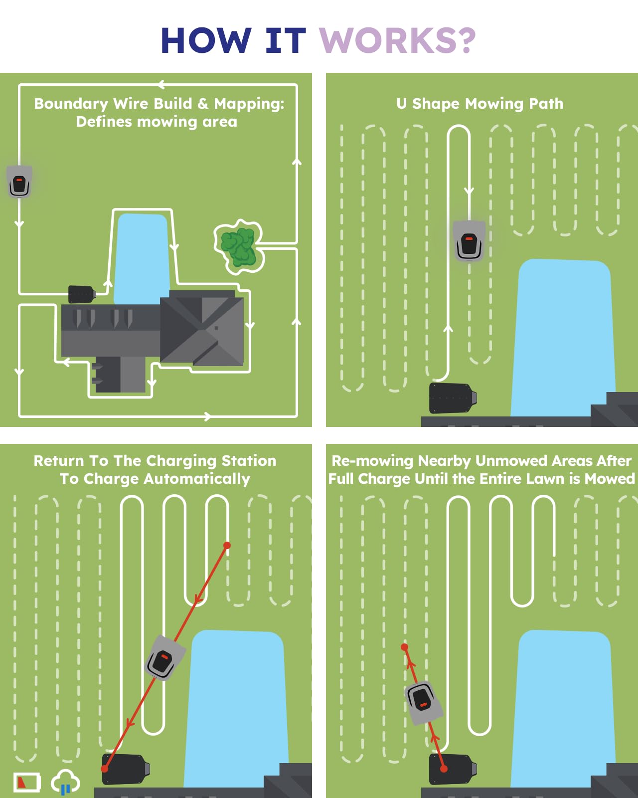 - 【APP Real-time Tracking】: Using our user-friendly APP, you can monitor mowing progress anytime, anywhere, schedule mowing times, receive start and end-of-mowing alerts, and see the real-time position and coverage area of the lawn mower robot. This eliminates guesswork, making lawn mower robot easy to keep your lawn in optimal condition