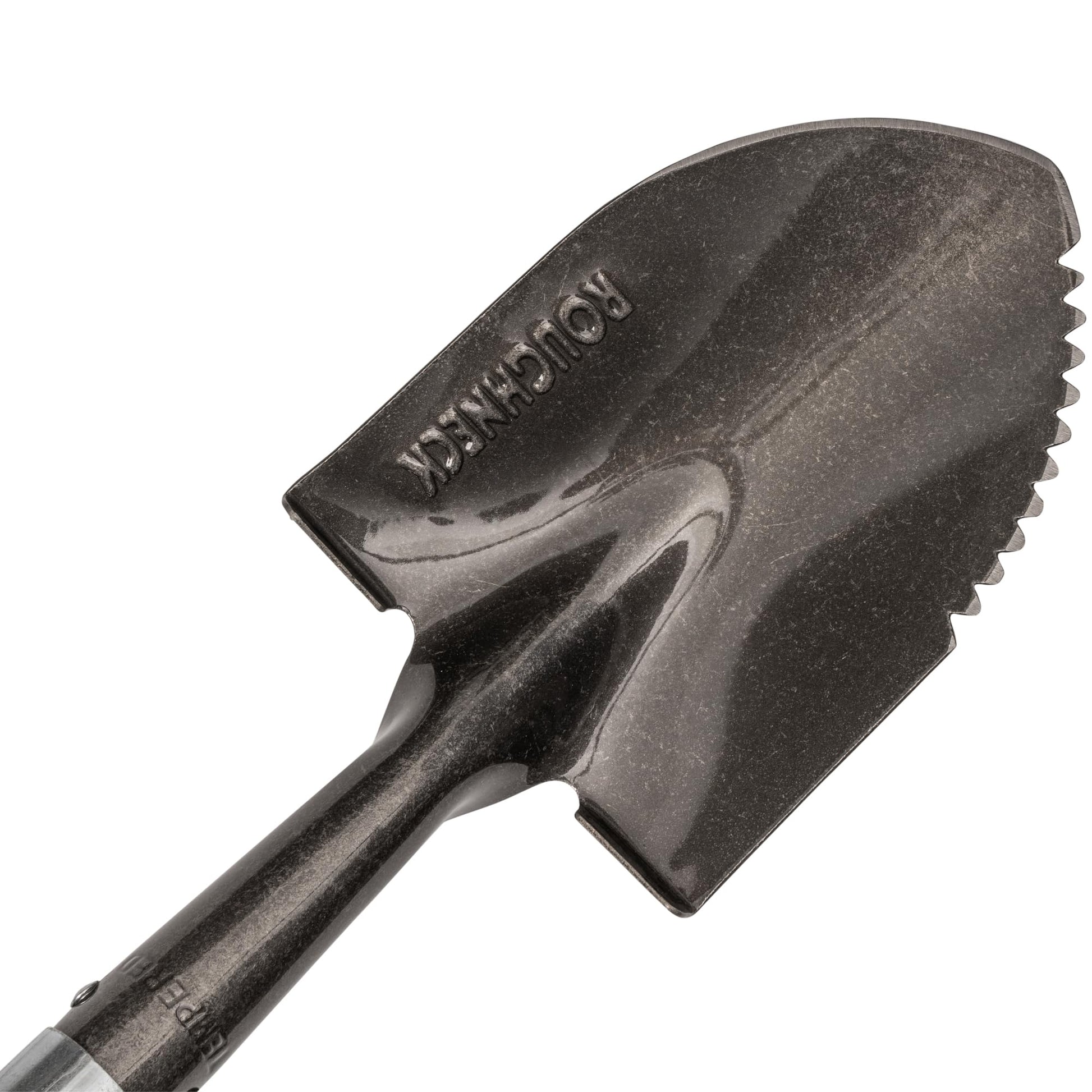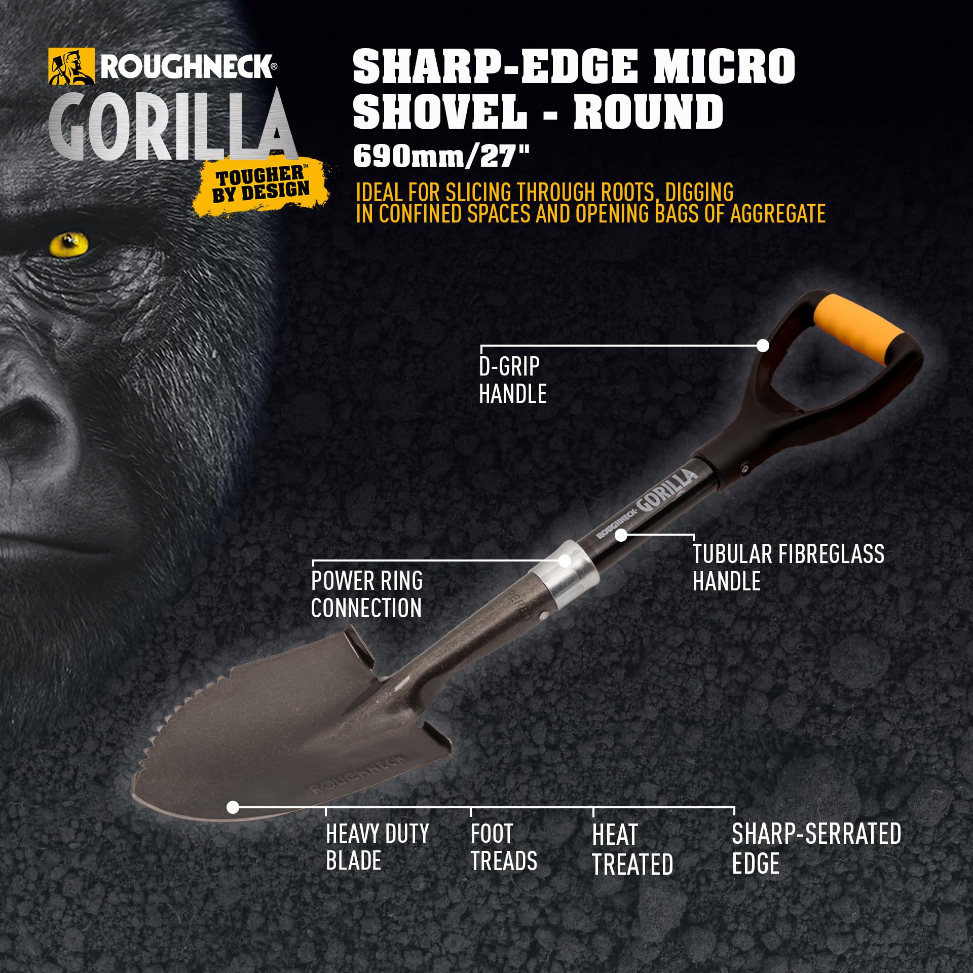 Details: The ROUGHNECK® GORILLA Sharp-Edge Micro Shovel is perfect for digging and shovelling in confined spaces. With a heavy-duty carbon steel blade and steel reinforced Power Ring socket, it offers the strength of much larger shovels with the convenience of a shorter length shaft. Featuring a sharp serrated edge which is ideal for digging in compacted ground, slicing through roots and opening bulk bags or bags of cement. Robust fibreglass handle ensures no shrinkage, expansion or rotting. Also featuring a full-size double-injected "D" grip handle for comfort in use. • Sharp serrated edge • Full-size D-grip • Soft grip • Heavy-duty blade • Foot treads • Heat-treated • Tumble, lacquered finish • Tubular fibreglass handle • Power ring connection • Size: 690mm/27“