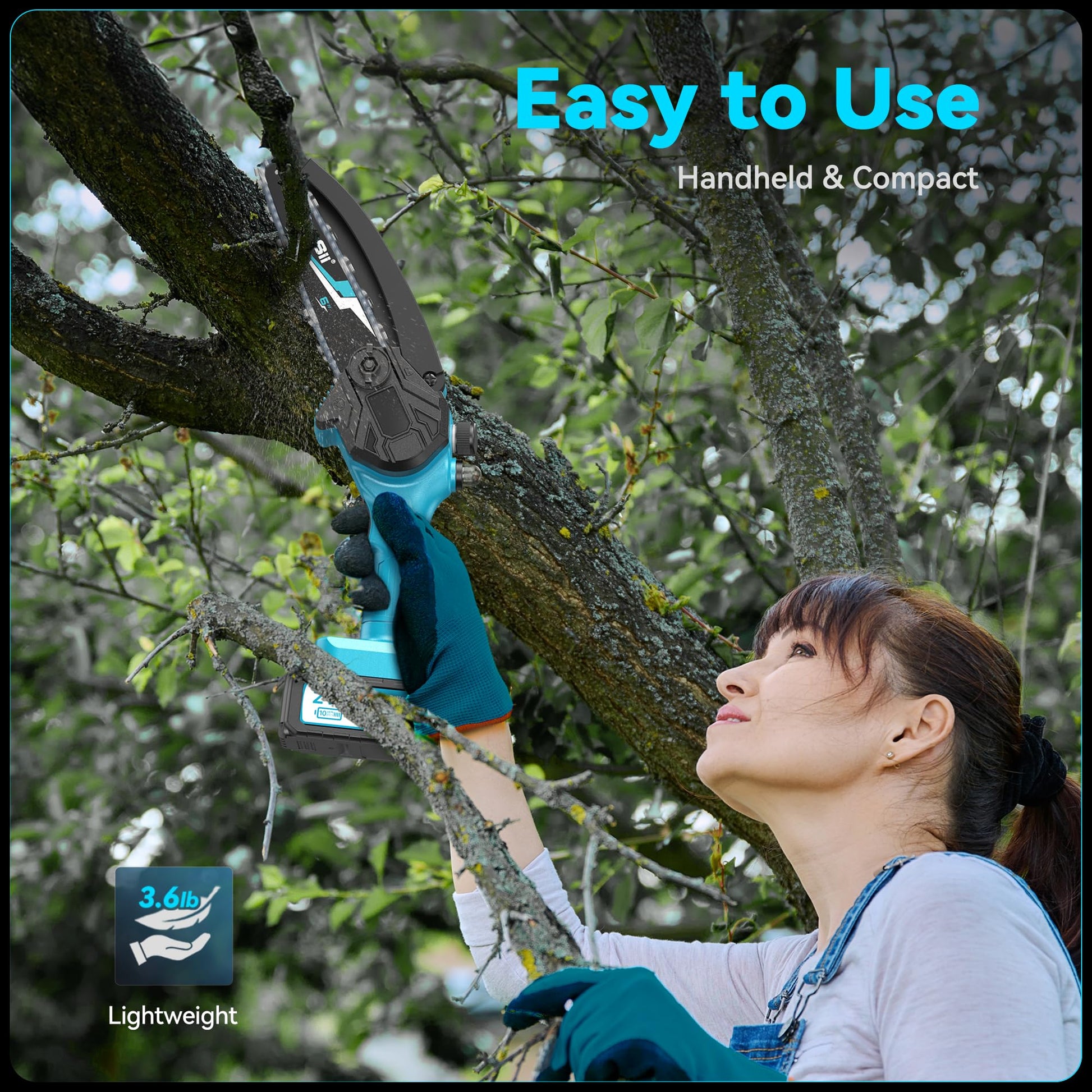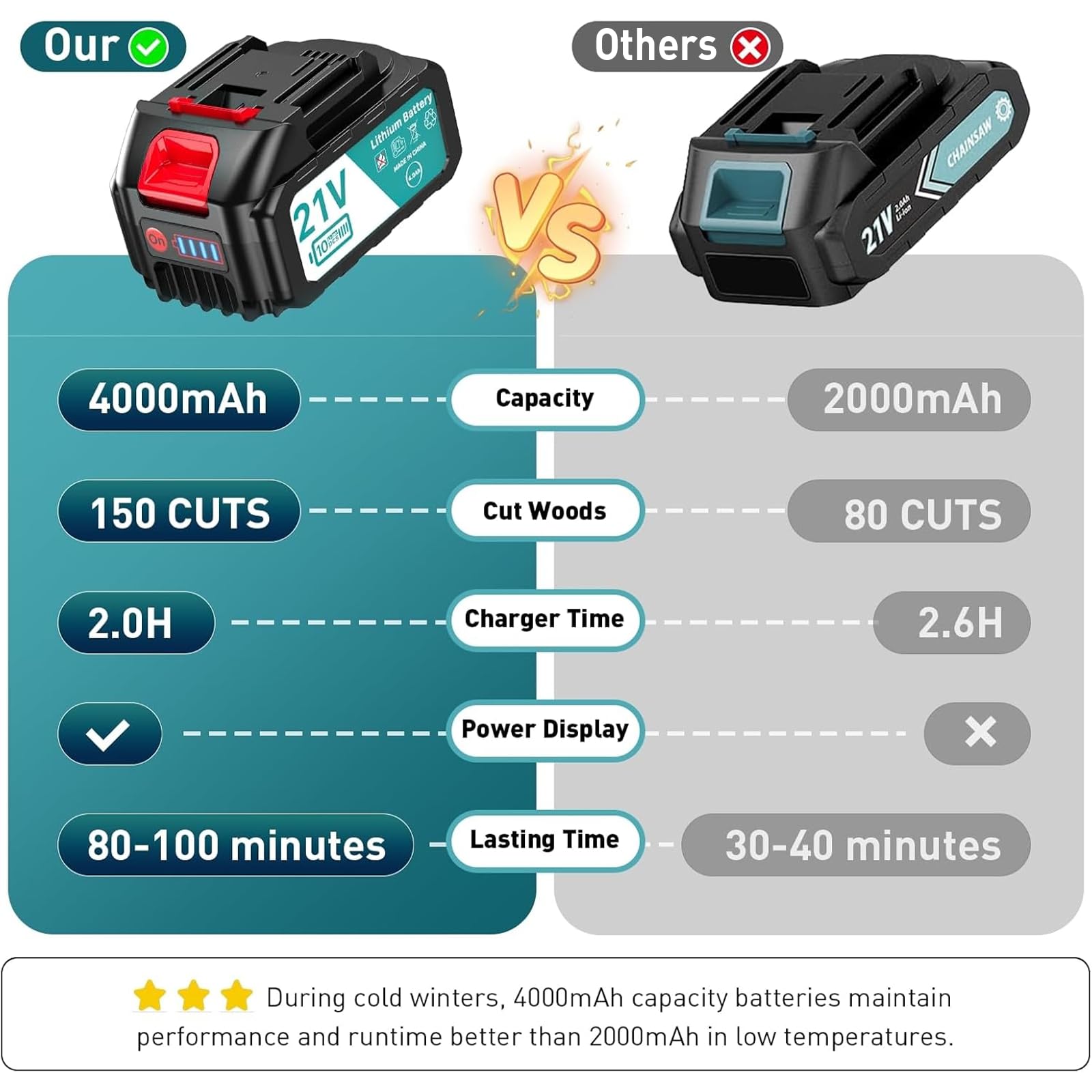 - 【High-Capacity 4000mAh Battery】Our mini electric chainsaw features a robust 4000mAh battery, providing 80-100 minutes of continuous use—double the runtime of typical 2000mAh batteries—enabling extended working sessions with fewer interruptions