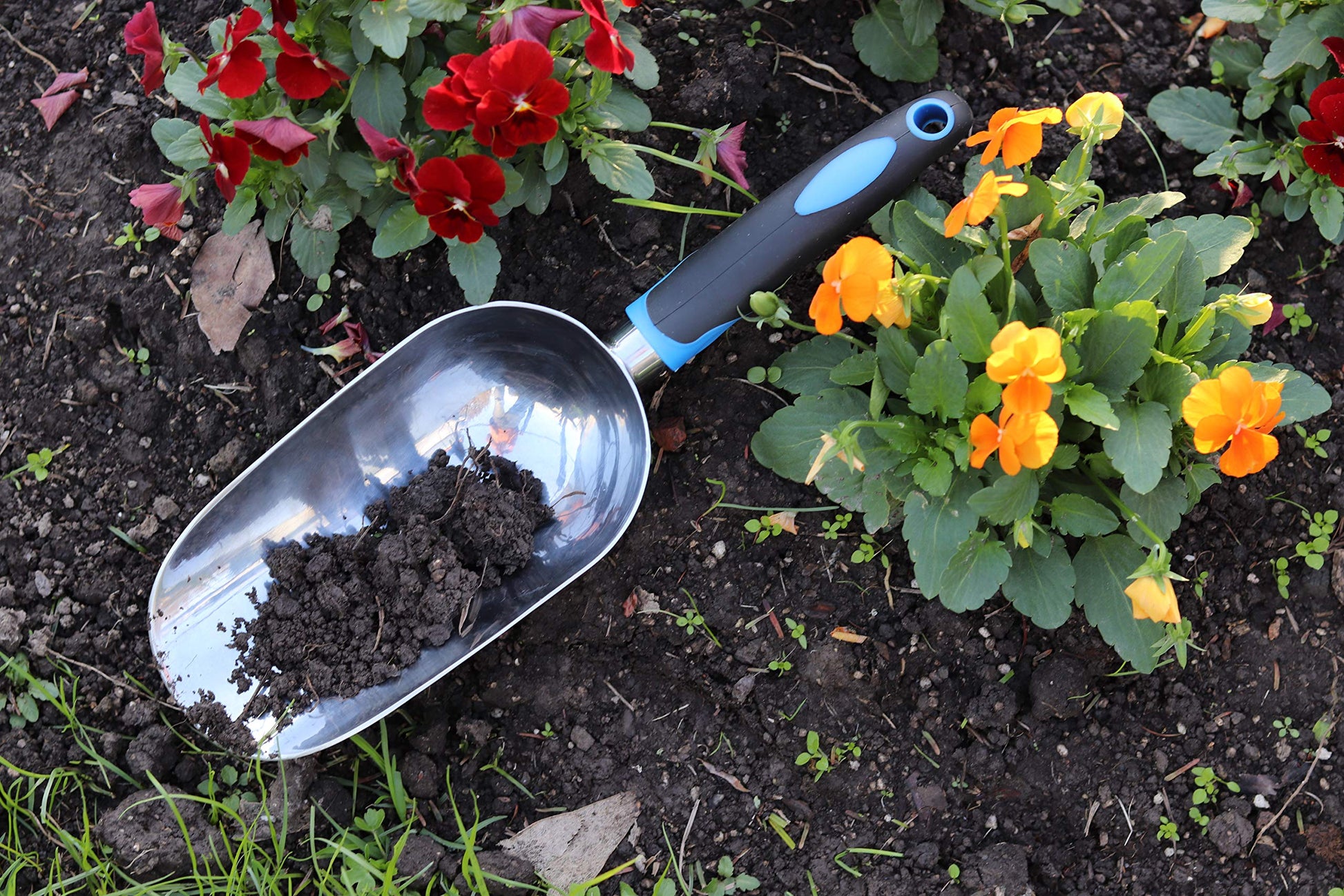 - Perfect Blade:This soil scoop is ideal for filling pots, tubs and baskets with soil or compost, quickly and efficiently to the wide and deeply dished blade.This garden trowel is polished aluminum head resists rust for lasting value,Cuts through tough turf cleanly.