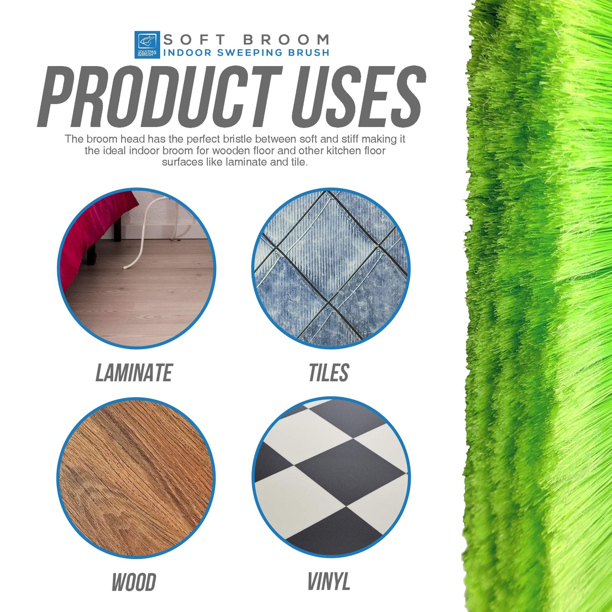 - Soft Floor Brush - The broom head has the perfect bristle between soft and stiff making it the ideal indoor broom for wooden floor and other kitchen floor surfaces like laminate and tile.