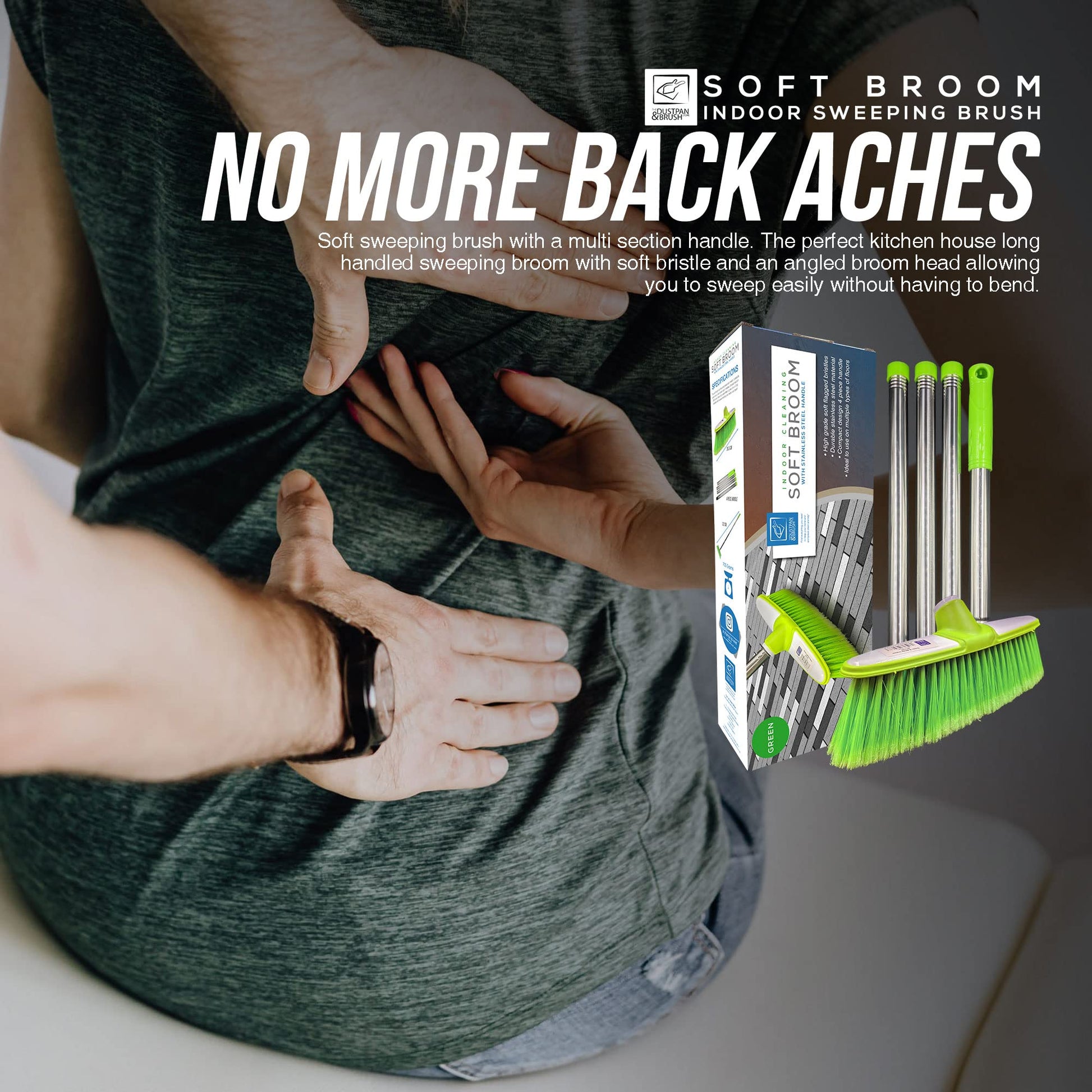 - Indoor Broom - Soft sweeping brush with a multi section handle. The perfect kitchen house long handled sweeping broom with soft bristle and an angled broom head allowing you to sweep easily without having to bend.