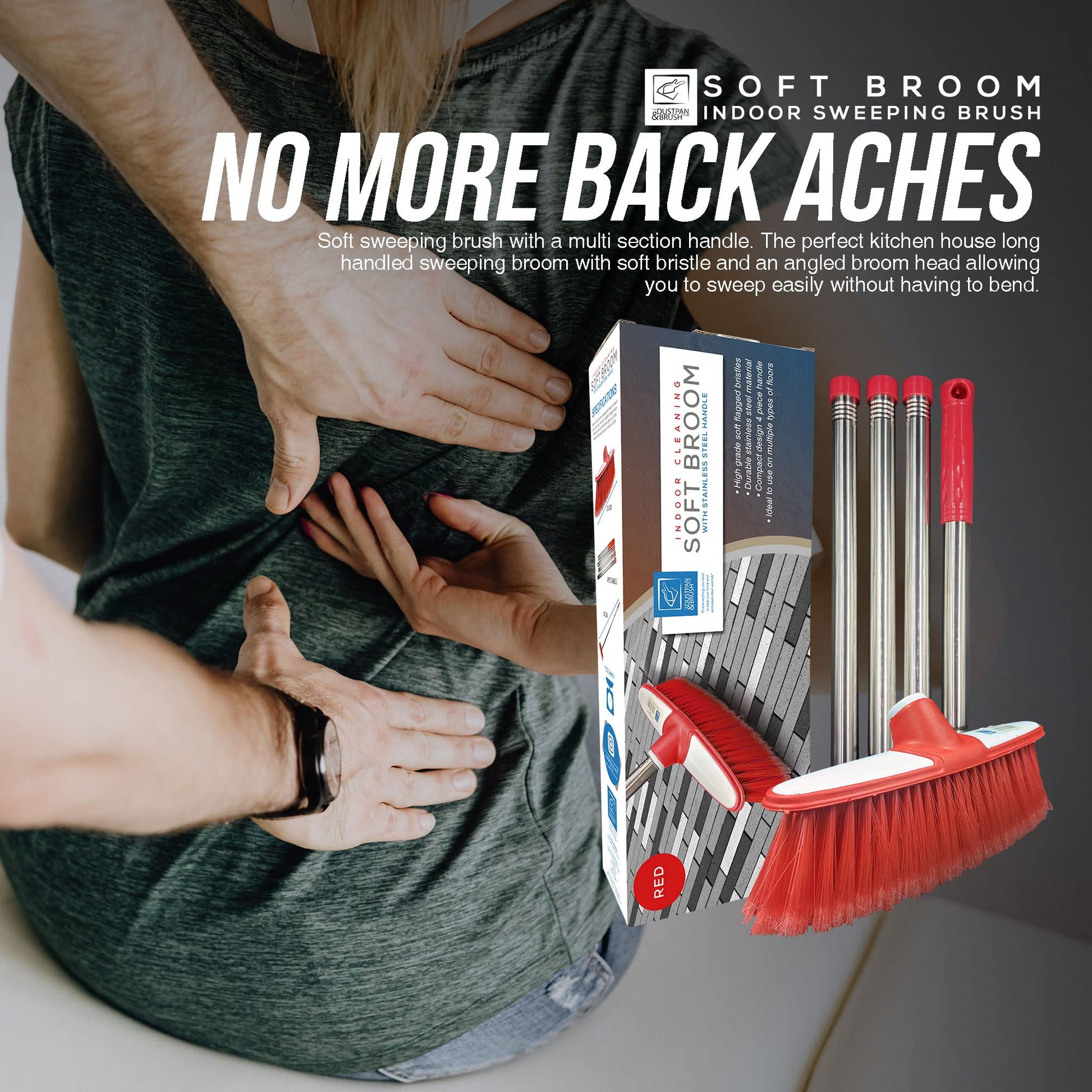 - Multi-section Long Metal Handle – Comes with a 4-section durable stainless-steel handle, this soft broom indoor will make a total of 132cm in length when fully assembled. No more backaches after sweeping the floors. This long handle is screw fed with the angle soft floor brush head for fine sweeping of dirt and dust on the kitchen floor.