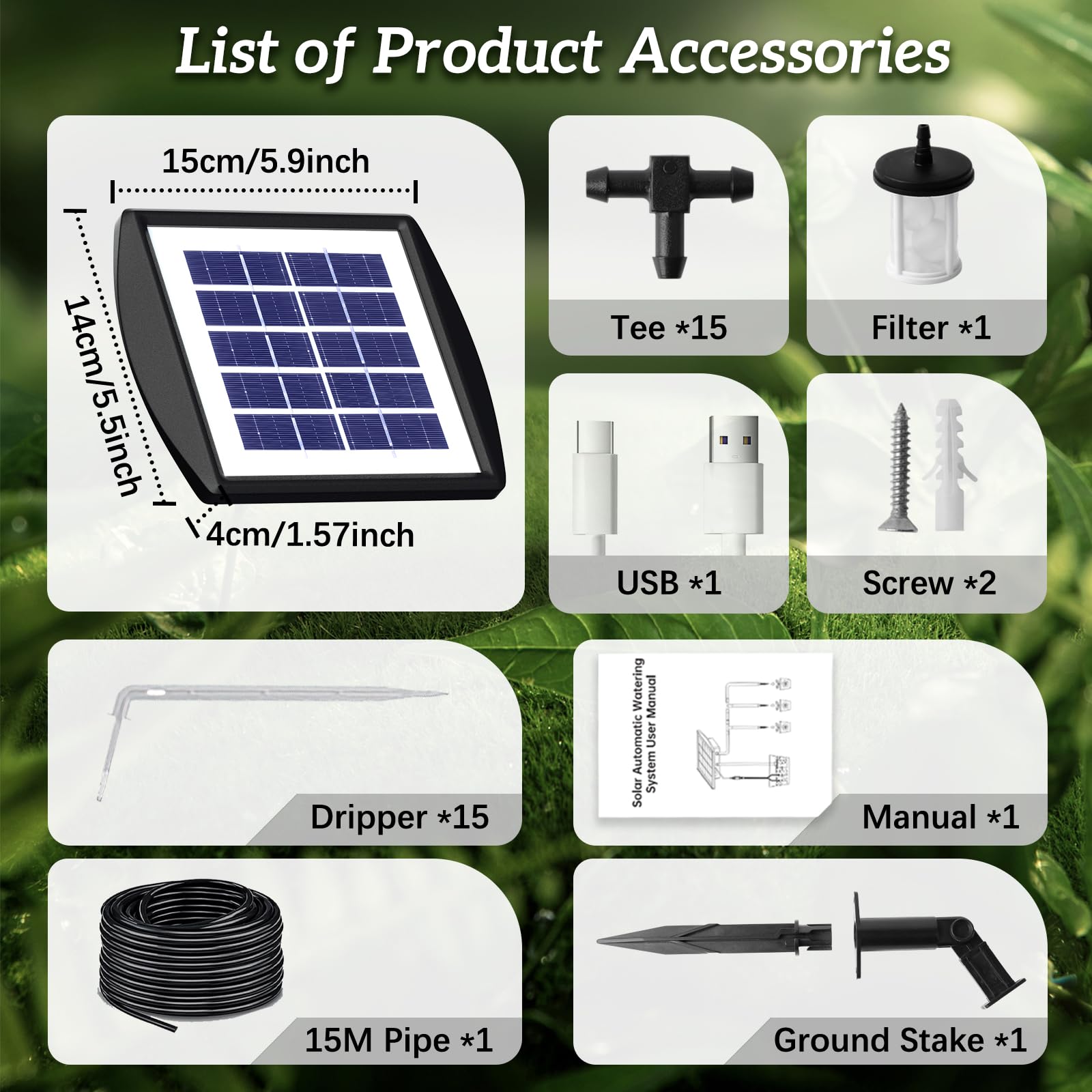 - š [15 Self Drip Irrigation Kits] - Drip irrigation system indoor kit includes 1 Solar powered mainframe, 1 Ground Plug Bracket, 15M silicone water hose, 15 drip tips,15 T-Joints, 1 Filter, 2 screws. Lets you easily create your own indoor irrigation system. This self watering system for plants is suitable for hanging plants, potted plants, and flower beds.
