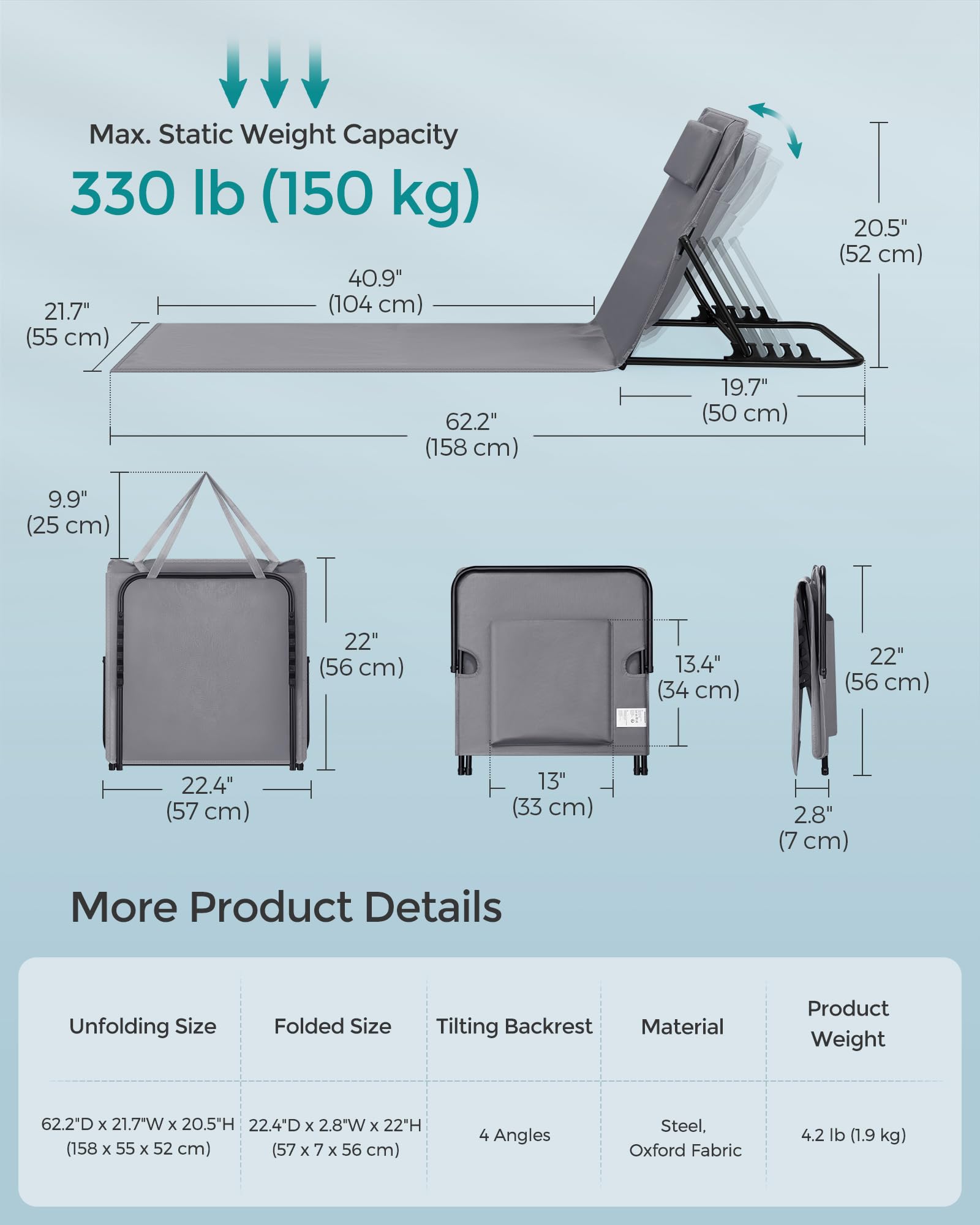 - 【4 INCLINE LEVELS】Customise your lounging with our sun lounger's backrest, adjustable to 4 angles (120°, 125°, 130°, or 135°) to provide the ideal position for sunbathing or basking in the outdoor breeze