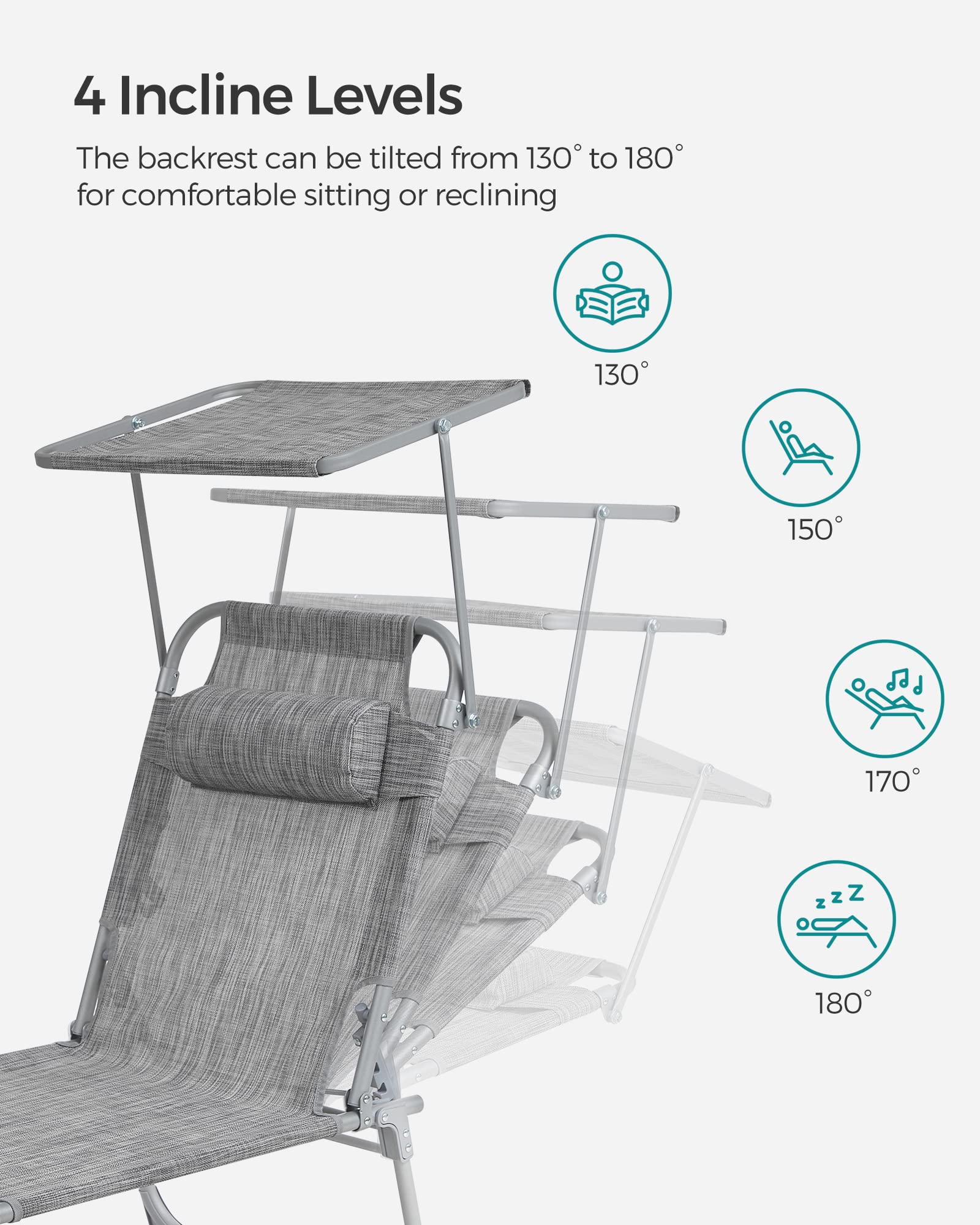 - [4-Angle Tilting Backrest] This sun lounger has a tilting backrest with 4 angle options and a removable headrest. Simply adjust it to your preferred position. Sit, recline, or lie down in this deck chair while enjoying the sunshine in the garden