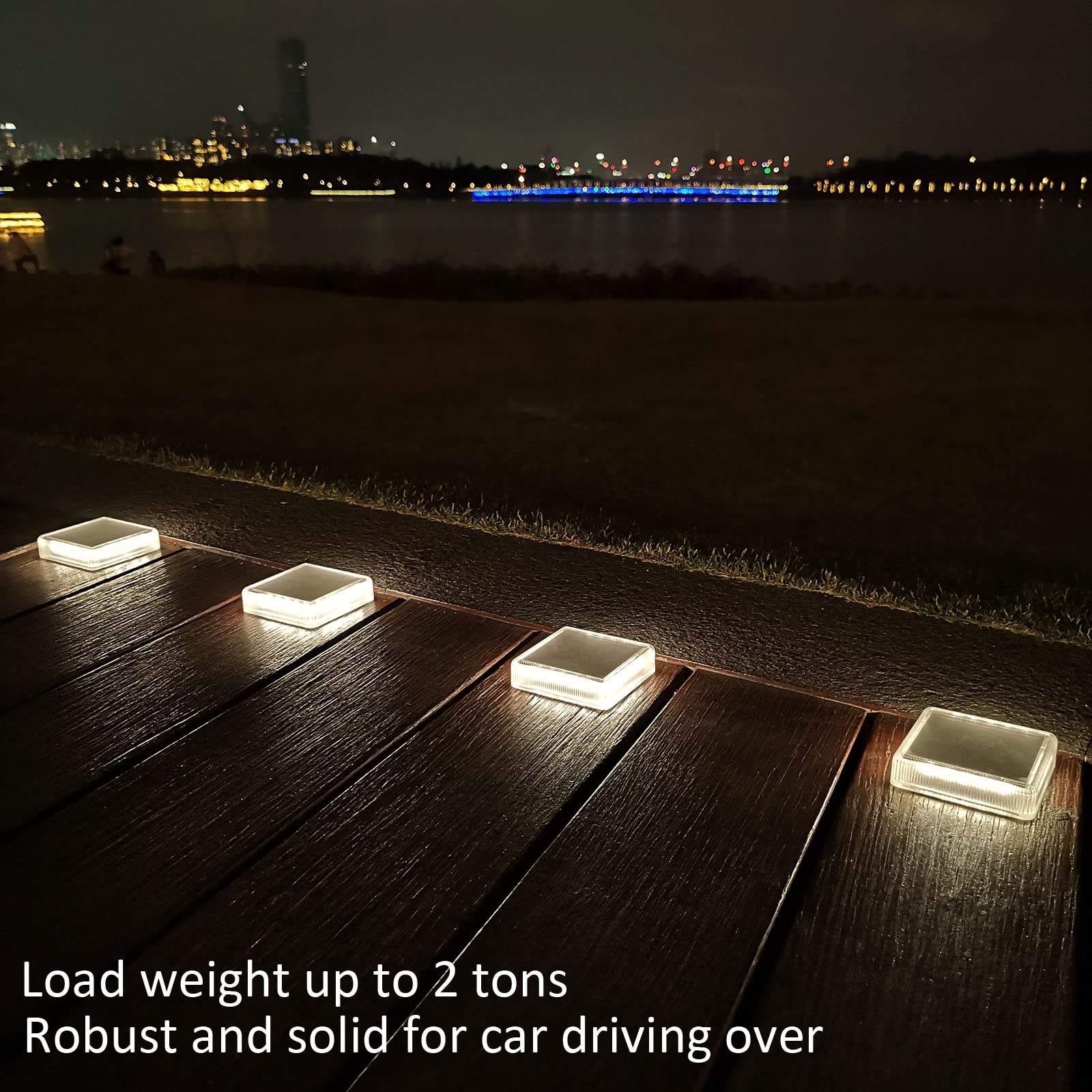 - 【Waterproof and Durable】The solar decking lights are IP68 protect grade, withstand terrible weather like a rainstorm, blizzard and daily heat, corrosion resistant. Robust and strongly built to resistant to pressure up to 10 tons, will not damage even car or truck run over, great for driveway.