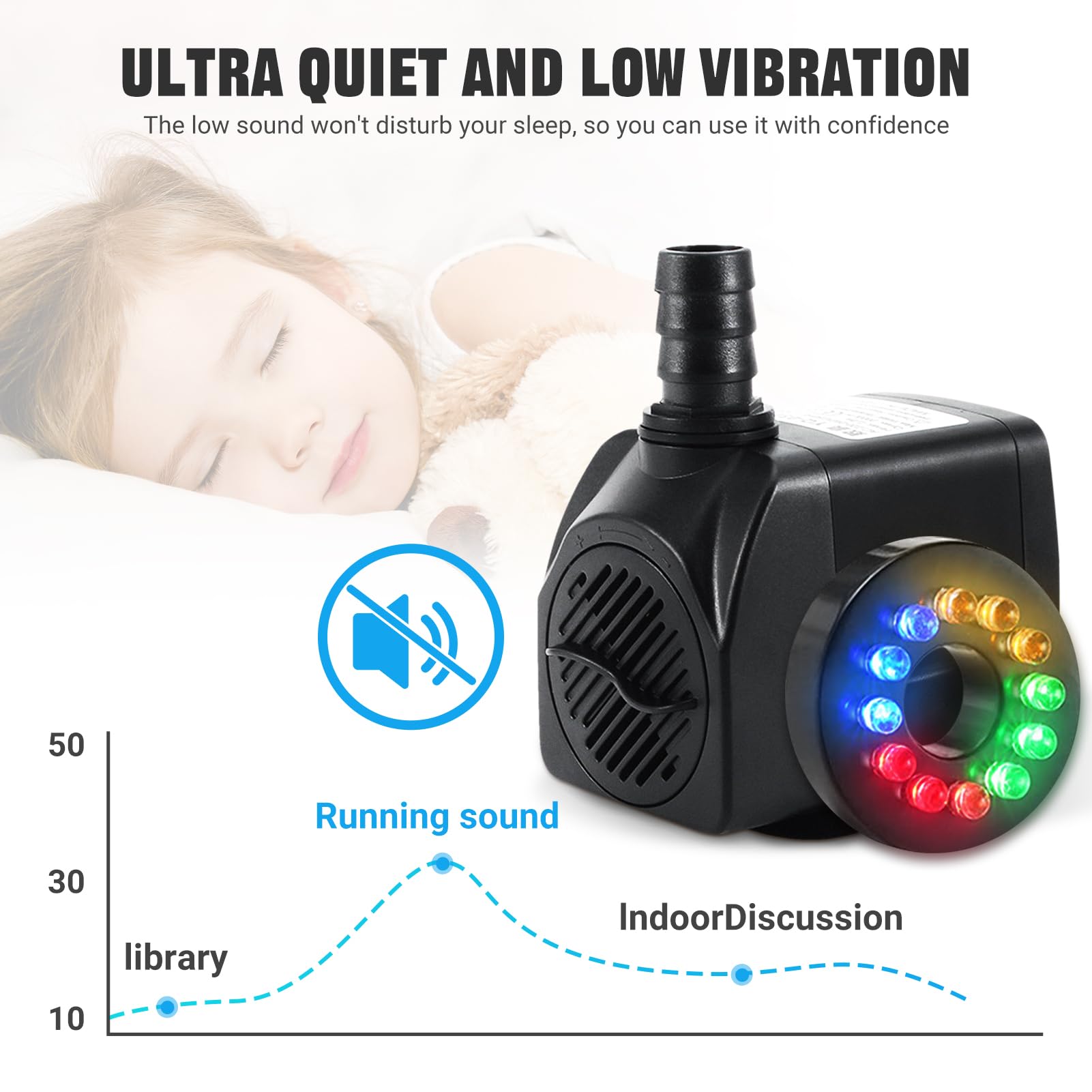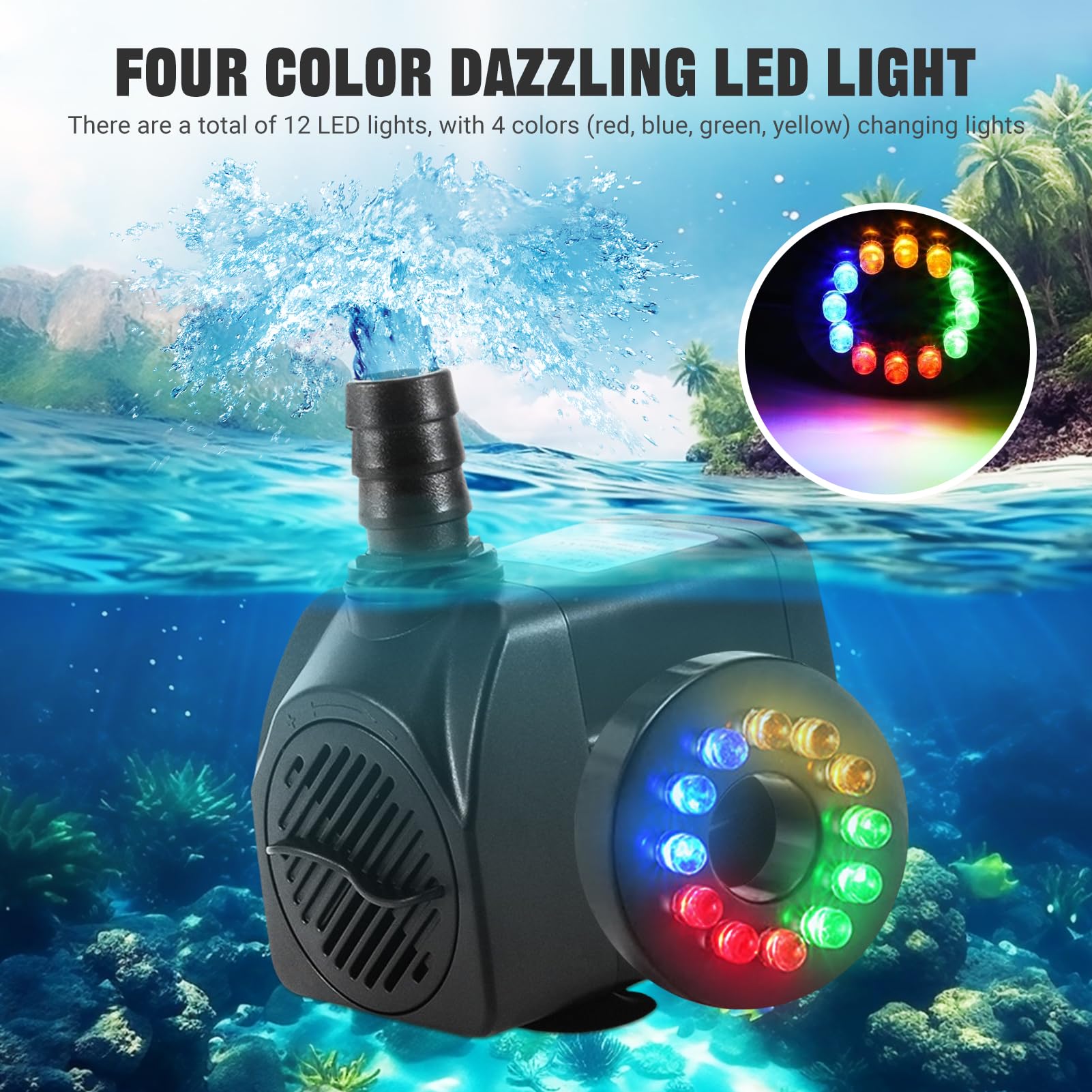 - 🐳【12LED Lights Water Feature Pump 】The small pond pump uses 12 super bright energy-saving LED colorful lights and 4 colors (red, blue, green, yellow) lights. Water feature pump provides amazing night lighting and are waterproof,give you a different visual experience.