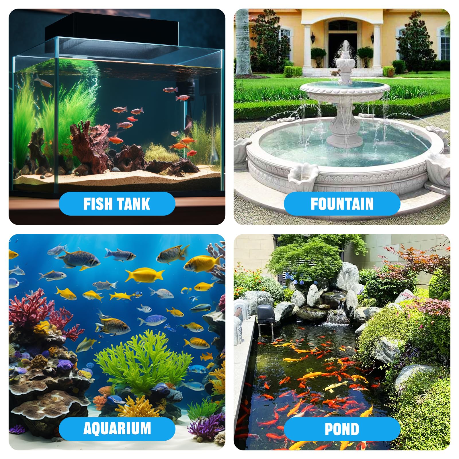 - 🐳【Multifuncational Water Feature Pump】This submersible water pump is not only as small aquarium pump, pond pump, fountain pump, also garden water pump,water feature pump. Can be easily applied in general scenes and is a very practical water feature pump.
