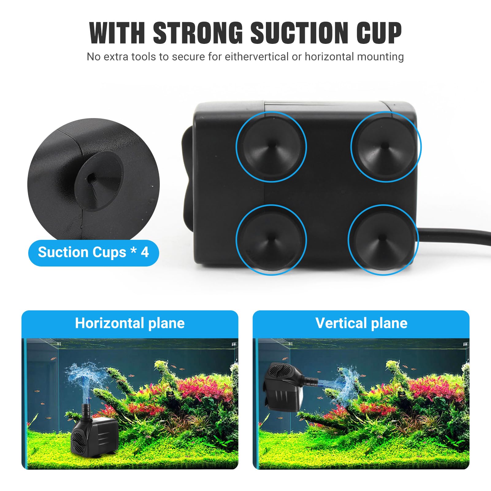 - 💦【Suction Cup Design】Long enough cord for easy installation,4 strong suction cups at the bottom of the fountain water pump help keep it in place, so you can stick it on the right side of the aquarium, either vertically or horizontally.